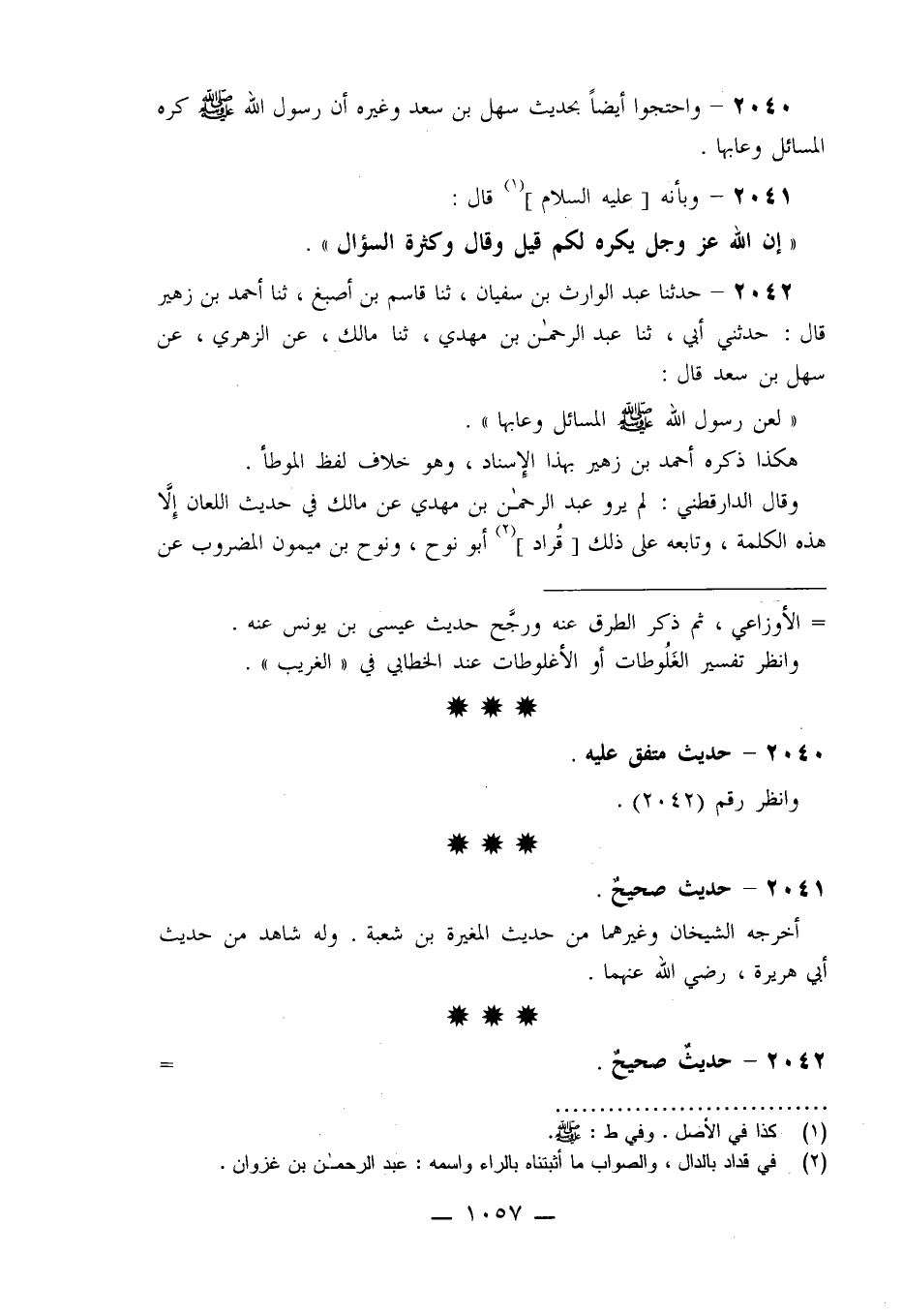 2042 - حَدَّثَنَا عَبْدُ الْوَارِثِ بْنُ سُفْيَانَ، ثنا قَاسِمُ بْنُ أَصْبَغَ، ثنا أَحْمَدُ بْنُ زُهَيْرٍ، قَالَ: حَدَّثَنِي أَبِي، ثنا عَبْدُ الرَّحْمَنِ بْنُ مَهْدِيٍّ، ثنا مَالِكٌ، عَنِ الزُّهْرِيِّ، عَنْ سَهْلِ بْنِ سَعْدٍ، قَالَ: §«لَعَنَ رَسُولُ اللَّهِ صَلَّى اللَّهُ عَلَيْهِ وَسَلَّمَ الْمَسَائِلَ وَعَابَهَا» هَكَذَا ذَكَرَهُ أَحْمَدُ بْنُ زُهَيْرٍ بِهَذَا الْإِسْنَادِ وَهُوَ خِلَافُ لَفْظِ الْمُوَطَّأِ، وَقَالَ الدَّرَاقُطْنِيُّ: لَمْ يَرْوِ عَبْدُ الرَّحْمَنِ بْنُ مَهْدِيٍّ عَنْ مَالِكٍ فِي حَدِيثِ اللِّعَانِ إِلَّا هَذِهِ الْكَلِمَةَ وَتَابَعَهُ عَلَى ذَلِكَ قُرَادٌ أَبُو نُوحٍ، وَنُوحُ بْنُ مَيْمُونٍ الْمَضْرُوبُ عَنْ -[1058]- مَالِكٍ فَذَكَرَ حَدِيثَ عَبْدِ الرَّحْمَنِ بْنِ مَهْدِيٍّ مِنْ رِوَايَةِ أَبِي خَيْثَمَةَ وَالْمَخْزُومِيِّ، وَأَحْمَدَ بْنِ سِنَانٍ، عَنِ ابْنِ مَهْدِيٍّ، كَمَا ذَكَرَهُ ابْنُ أَبِي خَيْثَمَةَ سَوَاءً،