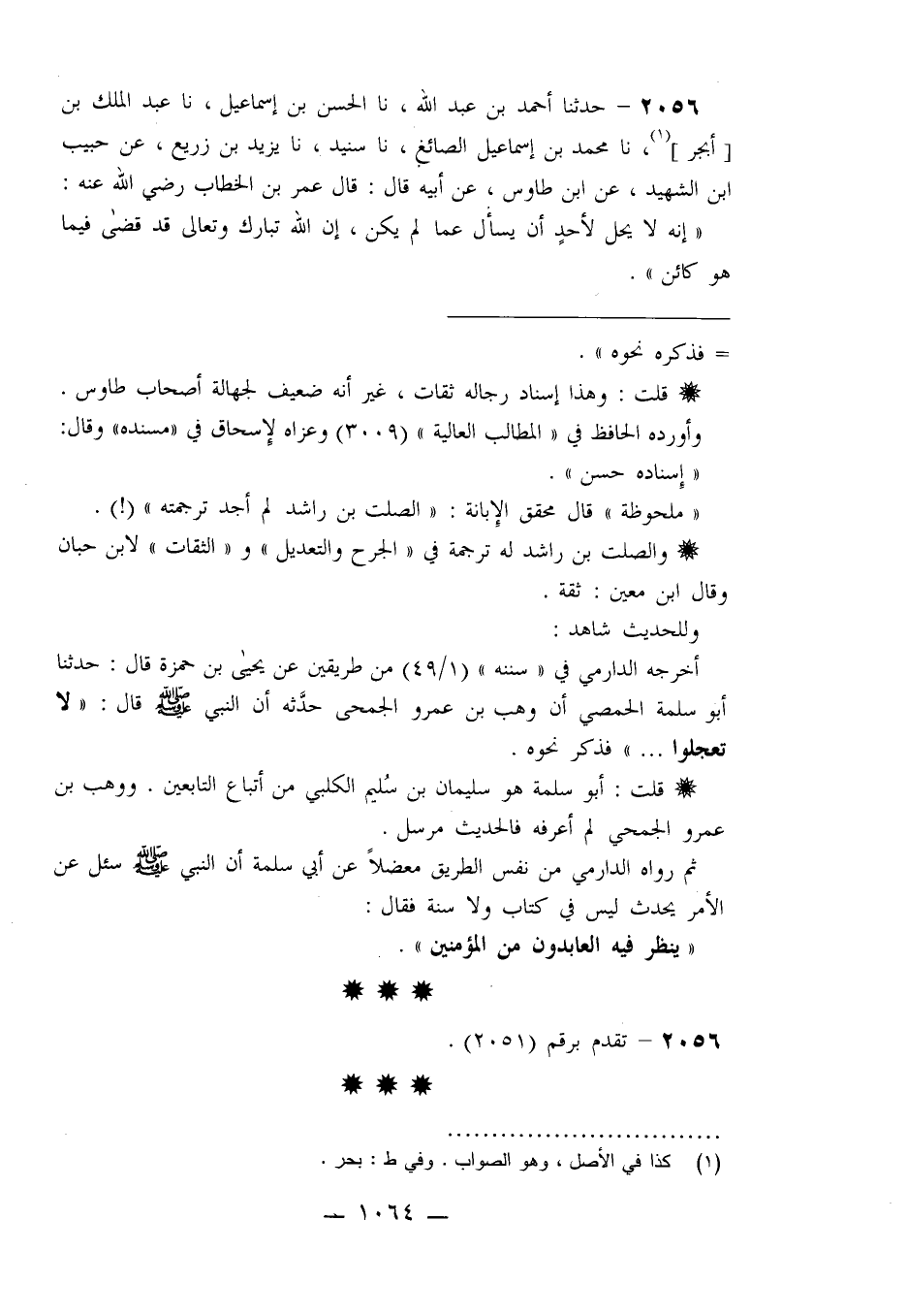 2056 - حَدَّثَنَا أَحْمَدُ بْنُ عَبْدِ اللَّهِ، نا الْحَسَنُ بْنُ إِسْمَاعِيلَ، نا عَبْدُ الْمَلِكِ بْنُ أَبْجَرَ، نا مُحَمَّدُ بْنُ إِسْمَاعِيلَ الصَّائِغُ، نا سُنَيْدٌ، نا يَزِيدُ بْنُ زُرَيْعٍ، عَنْ حَبِيبِ بْنِ الشَّهِيدِ، عَنِ ابْنِ طَاوُسٍ، عَنْ أَبِيهِ، قَالَ: قَالَ عُمَرُ بْنُ الْخَطَّابِ رَضِيَ اللَّهُ عَنْهُ: «إِنَّهُ §لَا يَحِلُّ لِأَحَدٍ أَنْ يَسْأَلَ عَمَّا لَمْ يَكُنْ؛ إِنَّ اللَّهَ تَبَارَكَ وَتَعَالَى قَدْ قَضَى فِيمَا هُوَ كَائِنٌ»