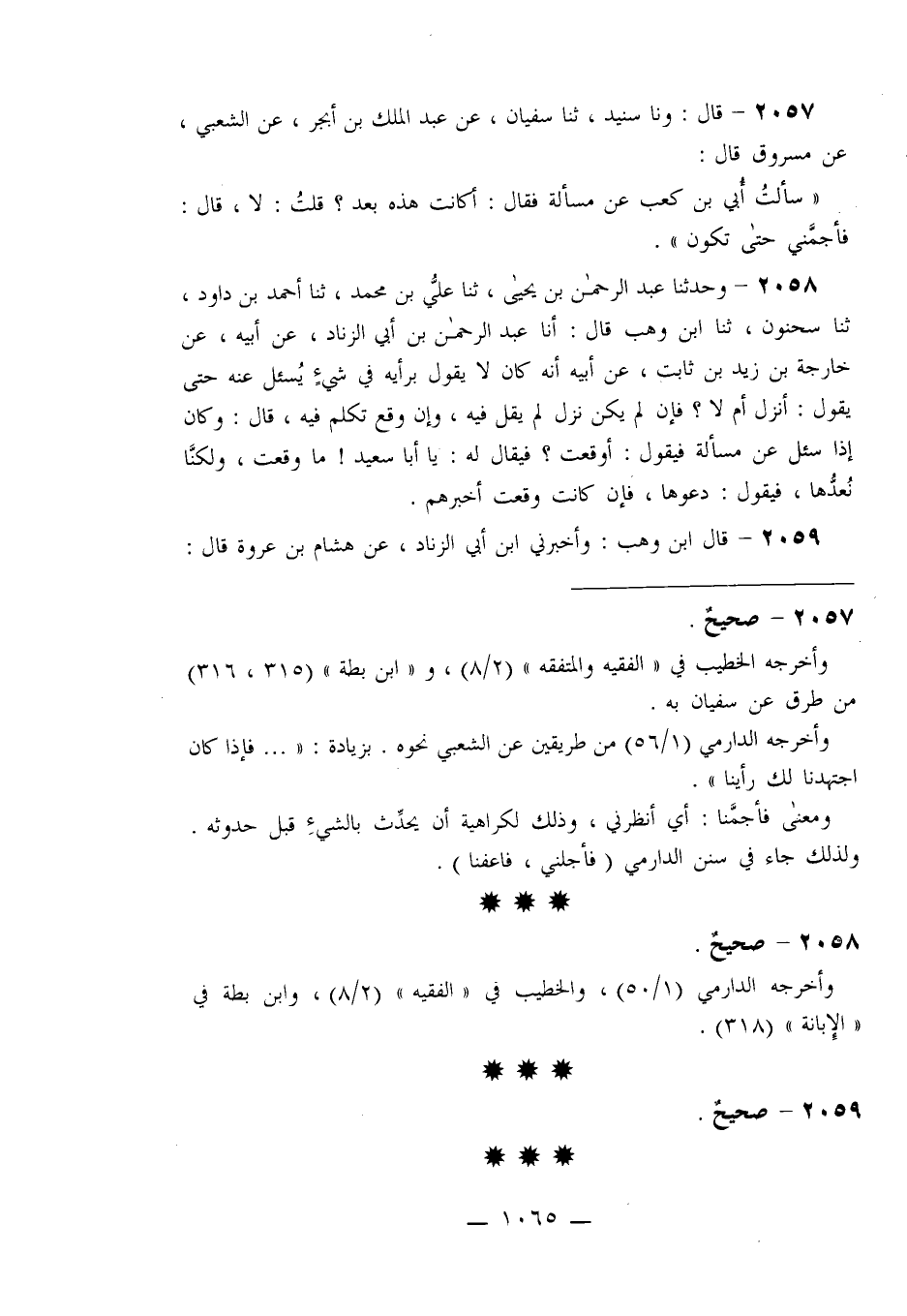 2057 - قَالَ: وَنا سُنَيْدٌ، ثنا سُفْيَانُ، عَنْ عَبْدِ الْمَلِكِ بْنِ أَبْجَرَ، عَنِ الشَّعْبِيِّ، عَنْ مَسْرُوقٍ، قَالَ: سَأَلْتُ أُبَيَّ بْنَ كَعْبٍ عَنْ مَسْأَلَةٍ، فَقَالَ: «§أَكَانَتْ هَذِهِ بَعْدُ؟» قُلْتُ: لَا قَالَ: «فَأَجِمَّنِي حَتَّى تَكُونَ»