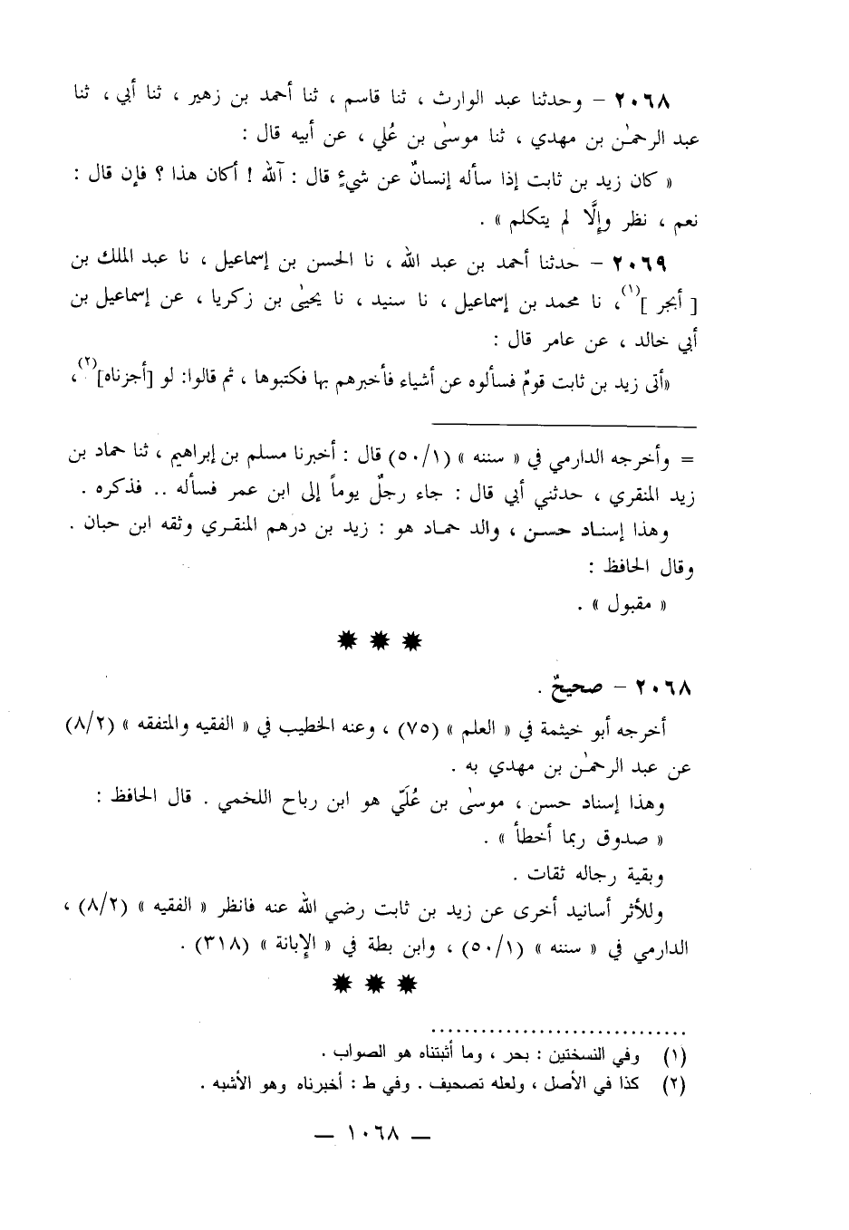 2068 - وَحَدَّثَنَا عَبْدُ الْوَارِثِ، ثنا قَاسِمٌ، ثنا أَحْمَدُ بْنُ زُهَيْرٍ، ثنا أَبِي، ثنا عَبْدُ الرَّحْمَنِ بْنُ مَهْدِيٍّ، ثنا مُوسَى بْنُ عَلِيٍّ، عَنْ أَبِيهِ قَالَ: كَانَ زَيْدُ بْنُ ثَابِتٍ، إِذَا سَأَلَهُ إِنْسَانٌ عَنْ شَيْءٍ، قَالَ: «§آللَّهِ أَكَانَ هَذَا؟» فَإِنْ قَالَ: «نَعَمْ نَظَرَ وَإِلَّا لَمْ يَتَكَلَّمْ»