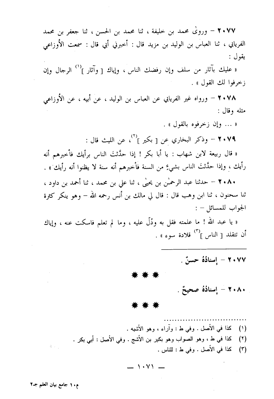 2077 - وَرَوى مُحَمَّدُ بْنُ خَلِيفَةَ، ثنا مُحَمَّدُ بْنُ الْحَسَنِ، ثنا جَعْفَرُ بْنُ مُحَمَّدٍ الْفِرْيَابِيُّ، ثنا الْعَبَّاسُ بْنُ الْوَلِيدِ بْنِ مَزْيَدٍ قَالَ: أَخْبَرَنِي أَبِي، قَالَ: سَمِعْتُ الْأَوْزَاعِيَّ يَقُولُ: §«عَلَيْكَ بِآثَارِ مَنْ سَلَفَ وَإِنْ رَفَضَكَ النَّاسُ وَإِيَّاكَ وَآثَارَ الرِّجَالِ وَإِنْ زَخْرَفُوا لَكَ الْقَوْلَ»