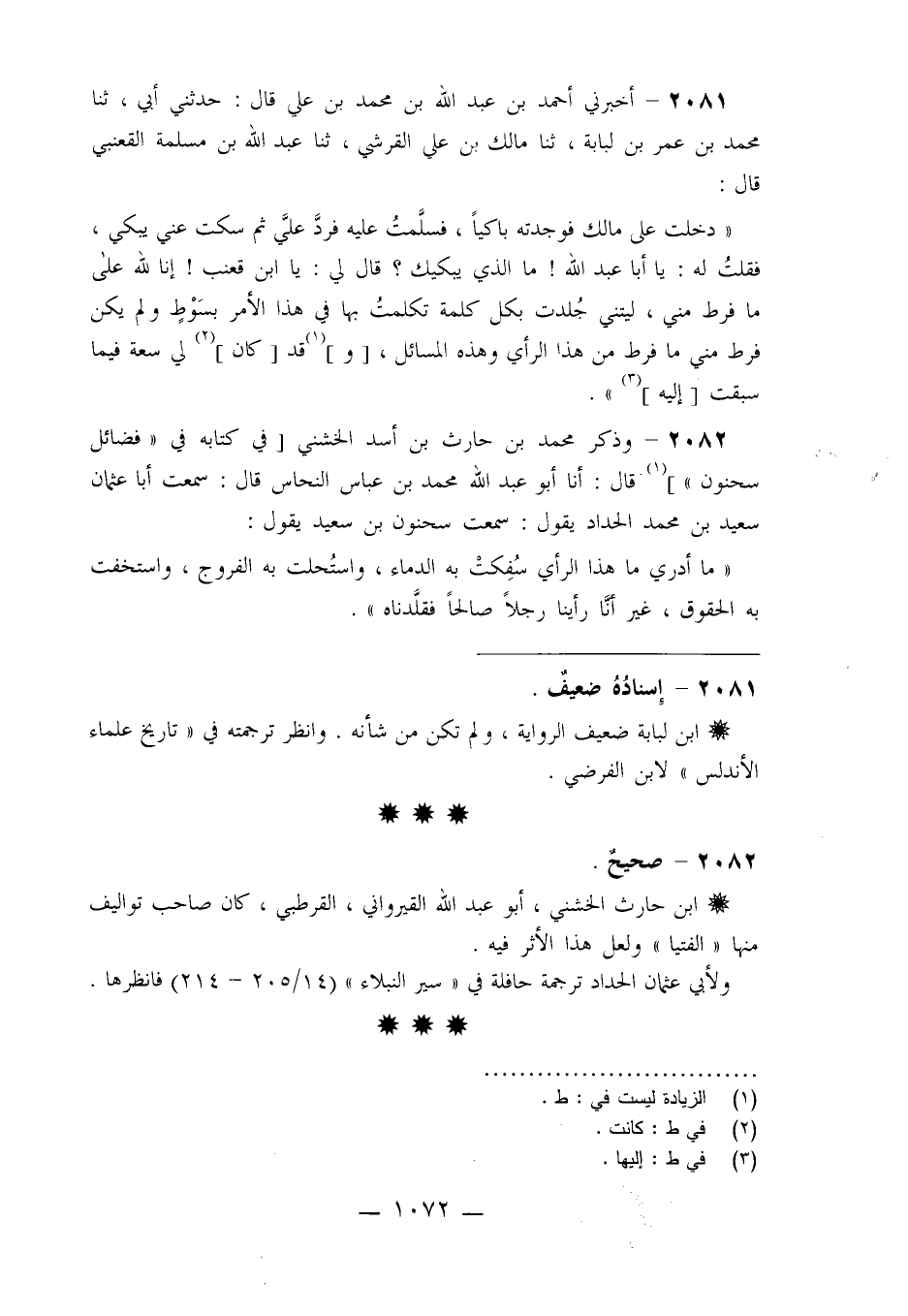 2082 - وَذَكَرَ مُحَمَّدُ بْنُ حَارِثِ بْنِ أَسَدٍ الْخُشَنِيُّ فِي كِتَابِهِ فِي فَضَائِلِ سُحْنُونٍ، قَالَ: أَنا أَبُو عَبْدِ اللَّهِ مُحَمَّدُ بْنُ عَبَّاسٍ النَّحَّاسُ قَالَ: سَمِعْتُ أَبَا عُثْمَانَ، سَعِيدَ بْنَ مُحَمَّدٍ الْحَدَّادَ يَقُولُ: سَمِعْتُ سُحْنُونَ بْنَ سَعِيدٍ يَقُولُ: §«مَا أَدْرِي مَا هَذَا الرَّأْيِ سُفِكَتْ بِهِ الدِّمَاءُ وَاسْتُحِلَّتْ بِهِ الْفُرُوجُ وَاسْتُخِفَّتْ بِهِ الْحُقُوقُ غَيْرَ أَنَّا رَأَيْنَا رَجُلًا صَالِحًا فَقَلَّدْنَاهُ»