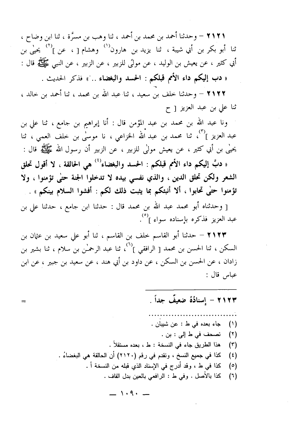 2121 - وَحَدَّثَنَا أَحْمَدُ بْنُ مُحَمَّدِ بْنِ أَحْمَدَ، ثنا وَهْبُ بْنُ مَسَرَّةَ، ثنا ابْنُ وَضَّاحٍ، ثنا أَبُو بَكْرِ بْنُ أَبِي شَيْبَةَ، ثنا يَزِيدُ بْنُ هَارُونَ، وَهِشَامٌ، عَنْ يَحْيَى بْنِ أَبِي كَثِيرٍ، عَنْ يَعِيشَ بْنِ الْوَلِيدِ، عَنْ مَوْلًى لِلزُّبَيْرِ، عَنِ الزُّبَيْرِ عَنِ النَّبِيِّ صَلَّى اللَّهُ عَلَيْهِ وَسَلَّمَ قَالَ: §«دَبَّ إِلَيْكُمْ دَاءُ الْأُمَمِ قَبْلَكُمُ الْحَسَدُ وَالْبَغْضَاءُ» فَذَكَرَ الْحَدِيثَ
