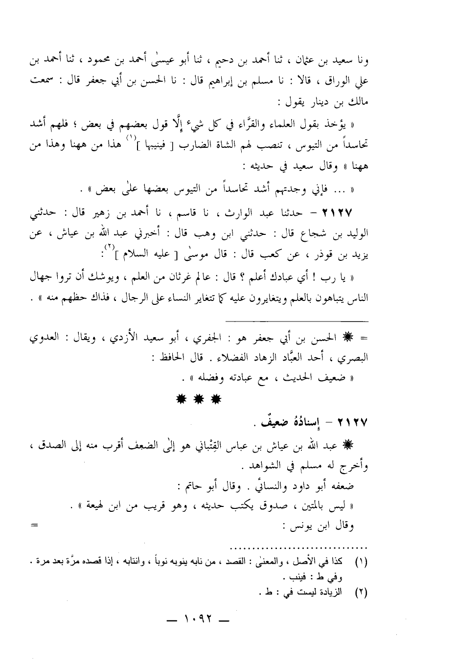 2127 - حَدَّثَنَا عَبْدُ الْوَارِثِ، نا قَاسِمٌ، نا أَحْمَدُ بْنُ زُهَيْرٍ قَالَ: حَدَّثَنِي الْوَلِيدُ بْنُ شُجَاعٍ قَالَ: حَدَّثَنِي ابْنُ وَهْبٍ، قَالَ أَخْبَرَنِي عَبْدُ اللَّهِ بْنُ عَيَّاشٍ، عَنْ يَزِيدَ بْنِ قَوْذَرٍ، عَنْ كَعْبٍ قَالَ: " قَالَ مُوسَى عَلَيْهِ السَّلَامُ: يَا رَبِّ أَيُّ عِبَادِكَ أَعْلَمُ؟ قَالَ: §عَالِمٌ غَرْثَانُ مِنَ الْعِلْمِ، وَيُوشِكُ أَنْ تَرَوْا جُهَّالَ النَّاسِ يَتَبَاهَوْنَ بِالْعِلْمِ وَيَتَغَايَرُونَ عَلَيْهِ كَمَا تَتَغَايَرُ النِّسَاءُ عَلَى الرِّجَالِ فَذَاكَ حَظُّهُمْ مِنْهُ "