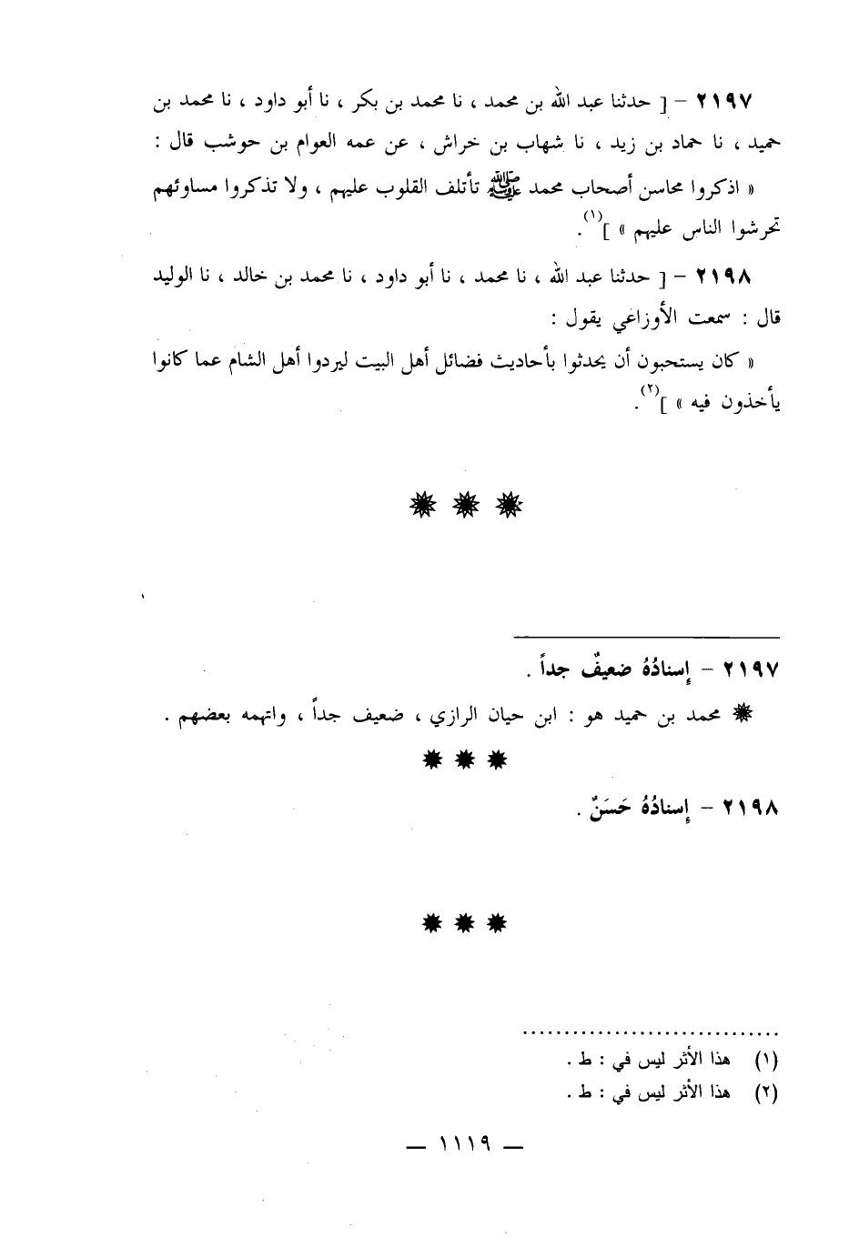 2197 - حَدَّثَنَا عَبْدُ اللَّهِ بْنُ مُحَمَّدٍ نا مُحَمَّدُ بْنُ بَكْرٍ نا أَبُو دَاوُدَ، نا مُحَمَّدُ بْنُ حُمَيْدٍ نا حَمَّادُ بْنُ زَيْدٍ نا شِهَابُ بْنُ خِرَاشٍ عَنْ عَمِّهِ الْعَوَّامِ بْنِ حَوْشَبٍ قَالَ: §«اذْكُرُوا مَحَاسِنَ أَصْحَابِ مُحَمَّدٍ صَلَّى اللَّهُ عَلَيْهِ وَسَلَّمَ تَأْتَلِفُ الْقُلُوبُ عَلَيْهِمْ وَلَا تَذْكُرُوا مَسَاوِئَهُمْ تُحَرِّشُوا النَّاسَ عَلَيْهِمْ»