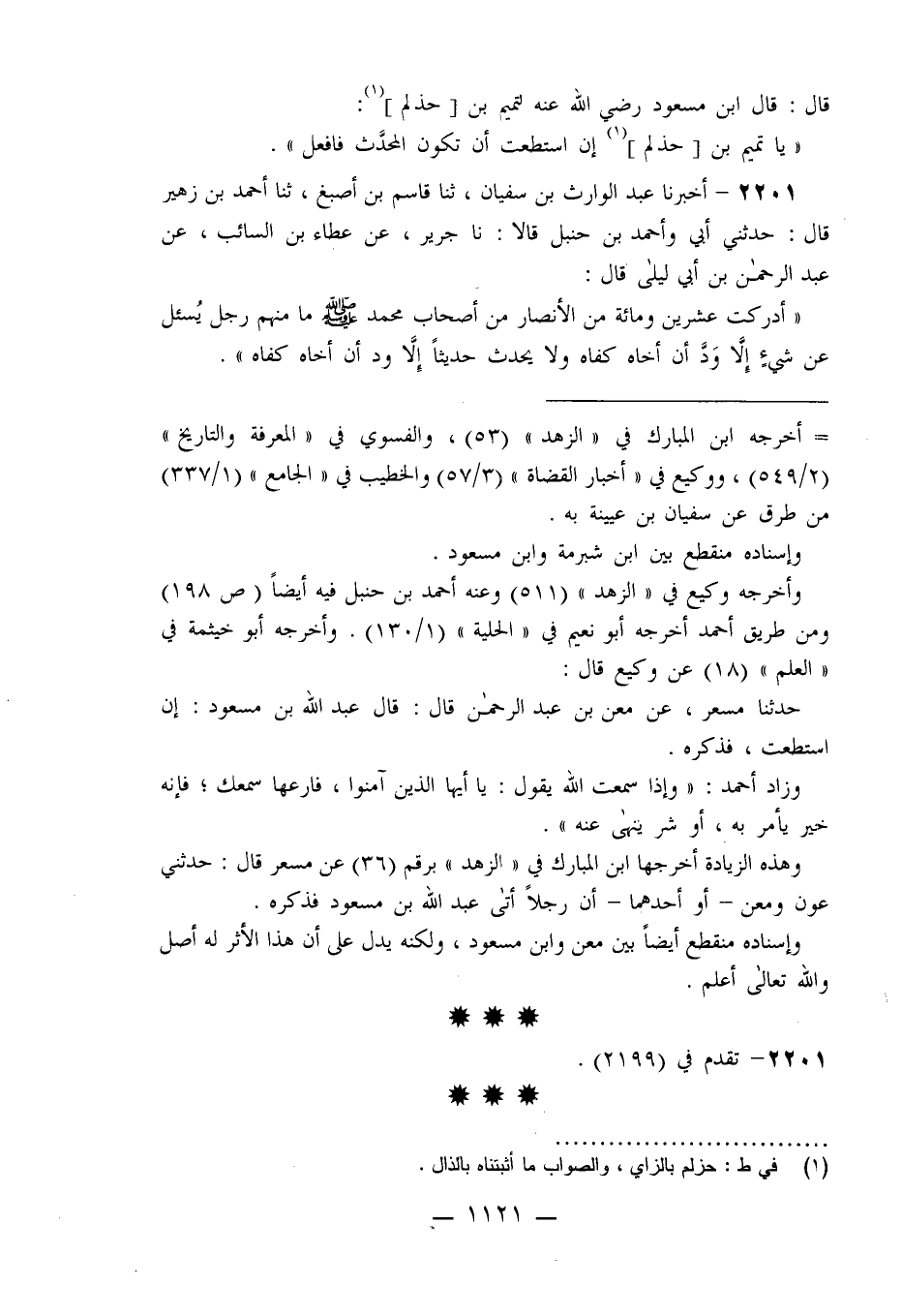 2201 - أَخْبَرَنَا عَبْدُ الْوَارِثِ بْنُ سُفْيَانَ، ثنا قَاسِمُ بْنُ أَصْبَغَ، ثنا أَحْمَدُ بْنُ زُهَيْرٍ قَالَ: حَدَّثَنِي أَبِي، وَأَحْمَدُ بْنُ حَنْبَلٍ قَالَا: نا جَرِيرٌ، عَنْ عَطَاءِ بْنِ السَّائِبِ، عَنْ عَبْدِ الرَّحْمَنِ بْنِ أَبِي لَيْلَى، قَالَ: §«أَدْرَكْتُ عِشْرِينَ وَمِائَةً مِنَ الْأَنْصَارِ مِنْ أَصْحَابِ مُحَمَّدٍ صَلَّى اللَّهُ عَلَيْهِ وَسَلَّمَ مَا مِنْهُمْ رَجُلٌ يُسْأَلُ عَنْ شَيْءٍ إِلَّا وَدَّ أَنَّ أَخَاهُ كَفَاهُ وَلَا يُحَدِّثُ حَدِيثًا إِلَّا وَدَّ أَنَّ أَخَاهَ كَفَاهُ» -[1122]-