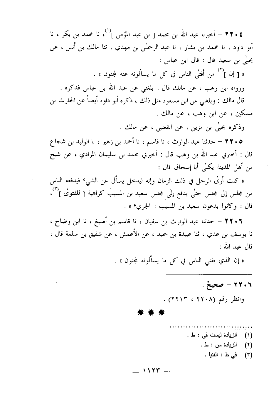 2204 - أَخْبَرَنَا عَبْدُ اللَّهِ بْنُ مُحَمَّدِ بْنِ عَبْدِ الْمُؤْمِنِ، نا مُحَمَّدُ بْنُ بَكْرٍ، نا أَبُو دَاوُدَ، نا مُحَمَّدُ بْنُ بَشَّارٍ، نا عَبْدُ الرَّحْمَنِ بْنُ مَهْدِيٍّ، ثنا مَالِكُ بْنُ أَنَسٍ، عَنْ يَحْيَى بْنِ سَعِيدٍ قَالَ: قَالَ ابْنُ عَبَّاسٍ: «إِنَّ §مَنْ أَفْتَى النَّاسَ فِي كُلِّ مَا يَسْأَلُونَهُ عَنْهُ لَمَجْنُونٌ» وَرَوَاهُ وَهْبٌ، عَنْ مَالِكٍ قَالَ: بَلَغَنِي عَنْ عَبْدِ اللَّهِ بْنِ عَبَّاسٍ فَذَكَرَهُ، قَالَ مَالِكٌ: وَبَلَغَنِي عَنِ ابْنِ مَسْعُودٍ مِثْلُ ذَلِكَ، ذَكَرَهُ أَبُو دَاوُدَ أَيْضًا عَنِ الْحَارِثِ بْنِ مِسْكِينٍ، عَنِ ابْنِ وَهْبٍ، عَنْ مَالِكٍ، وَذَكَرَهُ يَحْيَى بْنُ مُزَيْنٍ عَنِ الْقَعْنَبِيِّ، عَنْ مَالِكٍ