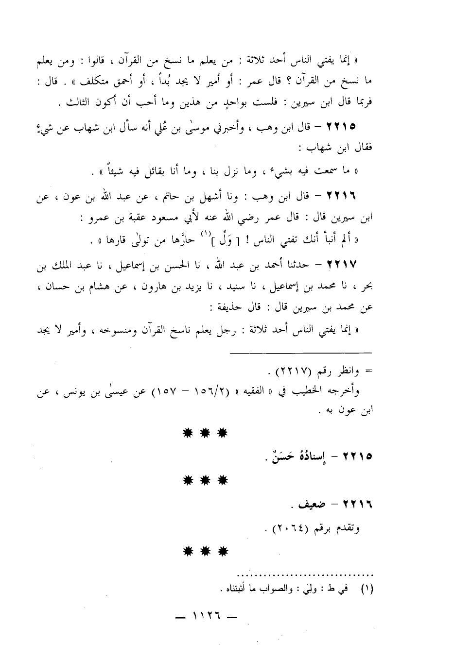 2216 - قَالَ ابْنُ وَهْبٍ، وَنا أَشْهَلُ بْنُ حَاتِمٍ، عَنْ عَبْدِ اللَّهِ بْنِ عَوْنٍ، عَنِ ابْنِ سِيرِينَ قَالَ: قَالَ عُمَرُ رَضِيَ اللَّهُ عَنْهُ، لِأَبِي مَسْعُودٍ عُقْبَةَ بْنِ عُمَرَ: «§أَلَمْ أُنَبَّأْ أَنَّكَ تُفْتِي النَّاسَ، وَلِّ حَارَّهَا مَنْ تَوَلَّى قَارَّهَا»