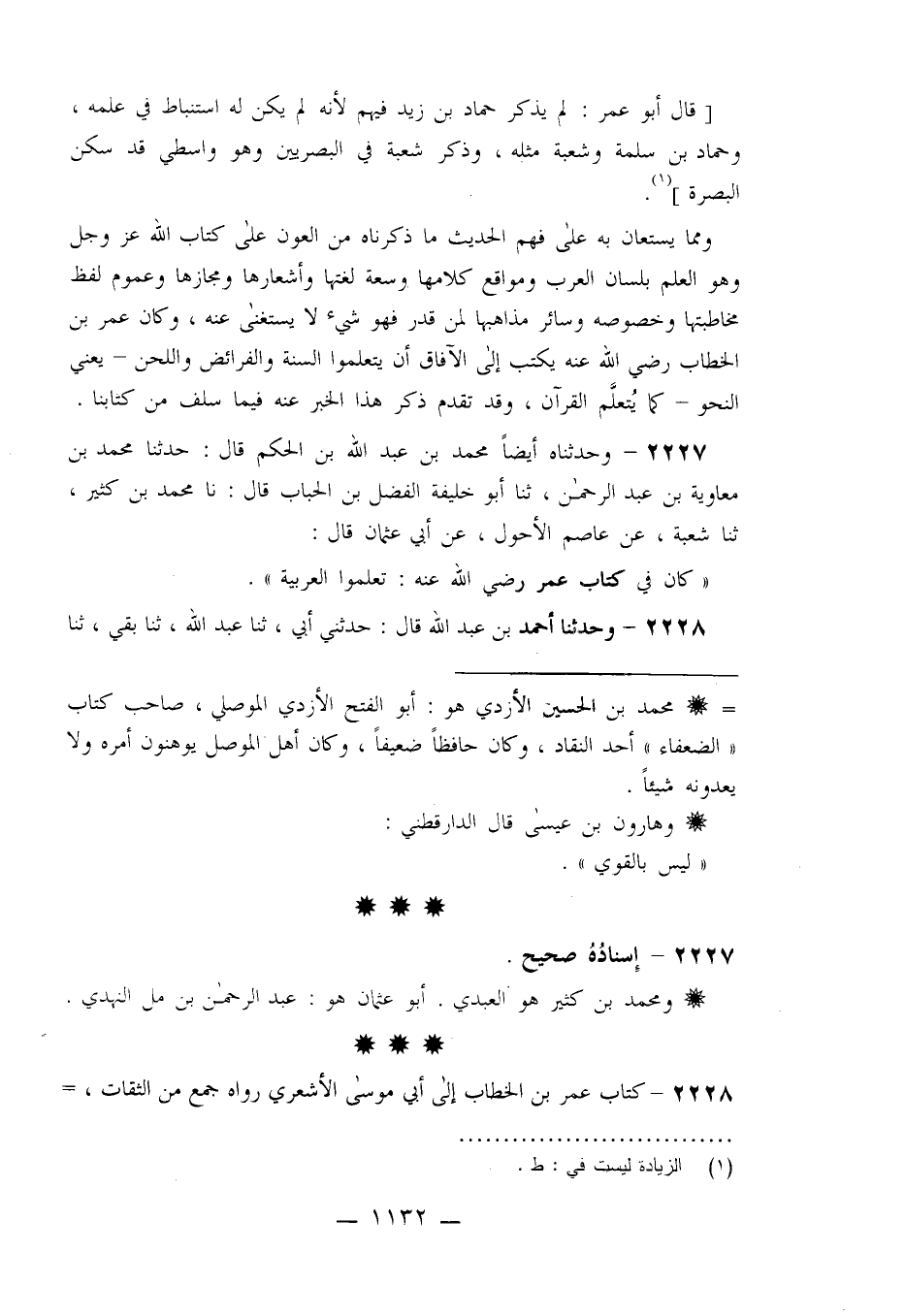 2227 - وَحَدَّثَنَاهُ أَيْضًا مُحَمَّدُ بْنُ عَبْدِ اللَّهِ بْنِ الْحَكَمِ، قَالَ حَدَّثَنَا مُحَمَّدُ بْنُ مُعَاوِيَةَ بْنِ عَبْدِ الرَّحْمَنِ، ثنا أَبُو خَلِيفَةَ الْفَضْلُ بْنُ الْحُبَابِ قَالَ: نا مُحَمَّدُ بْنُ كَثِيرٍ، ثنا شُعْبَةُ، عَنْ عَاصِمٍ الْأَحْوَلِ، عَنْ أَبِي عُثْمَانَ قَالَ: كَانَ §فِي كِتَابِ عُمَرَ رَضِيَ اللَّهُ عَنْهُ: تَعَلَّمُوا الْعَرَبِيَّةَ "