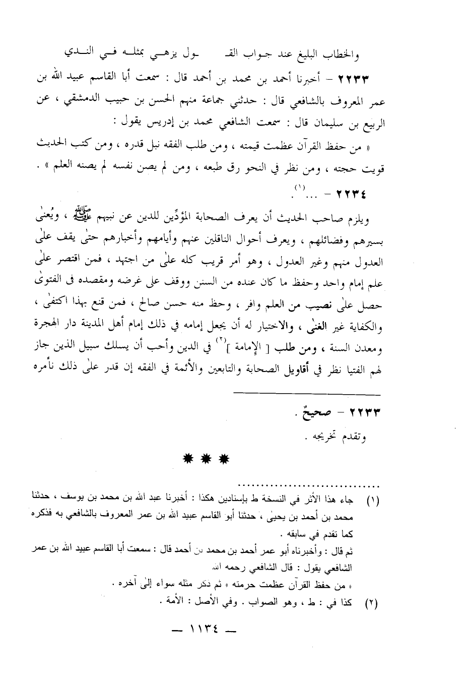 2233 - أَخْبَرَنَا أَحْمَدُ بْنُ مُحَمَّدِ بْنِ أَحْمَدَ، قَالَ: سَمِعْتُ أَبَا الْقَاسِمِ عُبَيْدَ اللَّهِ بْنَ عُمَرَ الْمَعْرُوفُ بِالشَّافِعِيِّ قَالَ: حَدَّثَنِي جَمَاعَةٌ مِنْهُمُ الْحَسَنُ بْنُ حَبِيبٍ الدِّمَشْقِيُّ، عَنِ الرَّبِيعِ بْنِ سُلَيْمَانَ قَالَ: سَمِعْتُ الشَّافِعِيَّ مُحَمَّدَ بْنَ إِدْرِيسَ يَقُولُ: §«مَنْ حَفِظَ الْقُرْآنَ عَظُمَتْ قِيمَتُهُ وَمَنْ طَلَبَ الْفِقْهَ نَبُلَ قَدْرُهُ وَمَنْ كَتَبَ الْحَدِيثَ قَوِيَتْ حُجَّتُهُ، وَمَنْ نَظَرَ فِي النَّحْوِ رَقَّ طَبْعُهُ، وَمَنْ لَمْ يَصُنْ نَفْسَهُ لَمْ يَصُنْهُ الْعِلْمُ»