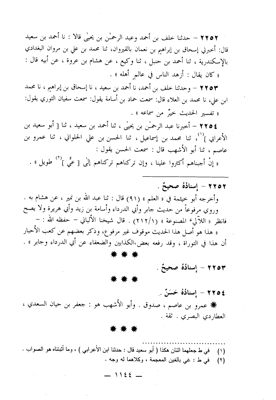 2254 - أَخْبَرَنَا عَبْدُ الرَّحْمَنِ بْنُ يَحْيَى، ثنا أَحْمَدُ بْنُ سَعِيدٍ، ثنا أَبُو سَعِيدٍ بْنُ الْأَعْرَابِيِّ، ثنا مُحَمَّدُ بْنُ إِسْمَاعِيلَ، ثنا الْحَسَنُ بْنُ عَلِيٍّ الْحُلْوَانِيُّ، ثنا عَمْرُو بْنُ عَاصِمٍ، ثنا أَبُو الْأَشْهَبِ، قَالَ: سَمِعْتُ الْحَسَنَ يَقُولُ: «إِنْ §أَجَبْنَاهُمْ أَكْثَرُوا عَلَيْنَا وَإِنْ تَرَكْنَاهُمْ تَرَكْنَاهُمْ إِلَى عِيٍّ طَوِيلٍ» -[1145]-