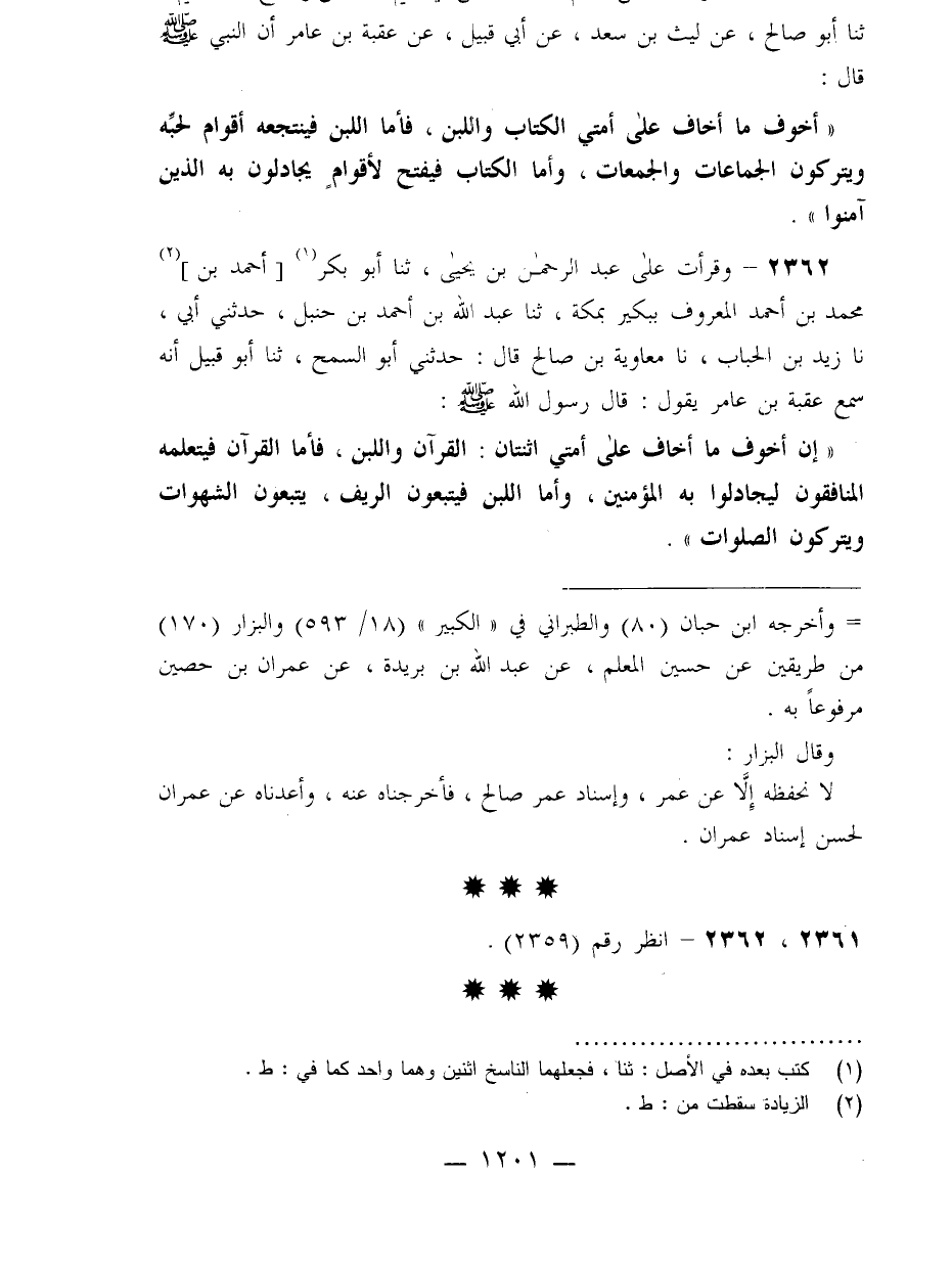 2362 - وَقَرَأْتُ عَلَى عَبْدِ الرَّحْمَنِ بْنِ يَحْيَى ثنا أَبُو بَكْرٍ أَحْمَدُ بْنُ مُحَمَّدِ بْنِ أَحْمَدَ الْمَعْرُوفُ بِبُكَيْرٍ بِمَكَّةَ ثنا عَبْدُ اللَّهِ بْنُ أَحْمَدَ بْنِ حَنْبَلٍ، حَدَّثَنِي أَبِي نا زَيْدُ بْنُ الْحُبَابِ، نا مُعَاوِيَةُ بْنُ صَالِحٍ، قَالَ: حَدَّثَنِي أَبُو السَّمْحِ، ثنا أَبُو قَبِيلٍ، أَنَّهُ سَمِعَ عُقْبَةَ بْنَ عَامِرٍ يَقُولُ: قَالَ رَسُولُ اللَّهِ صَلَّى اللَّهُ عَلَيْهِ وَسَلَّمَ: «إِنَّ §أَخْوَفَ مَا أَخَافُ عَلَى أُمَّتِي اثْنَتَانِ الْقُرْآنُ وَاللَّبَنُ فَأَمَّا الْقُرْآنُ فَيَتَعَلَّمُهُ الْمُنَافِقُونَ؛ لِيُجَادِلُوا بِهِ الْمُؤْمِنِينَ، وَأَمَّا اللَّبَنُ فَيَتَّبِعُونَ الرِّيفَ يَتَّبِعُونَ الشَّهَوَاتِ وَيَتْرُكُونَ الصَّلَوَاتِ»
