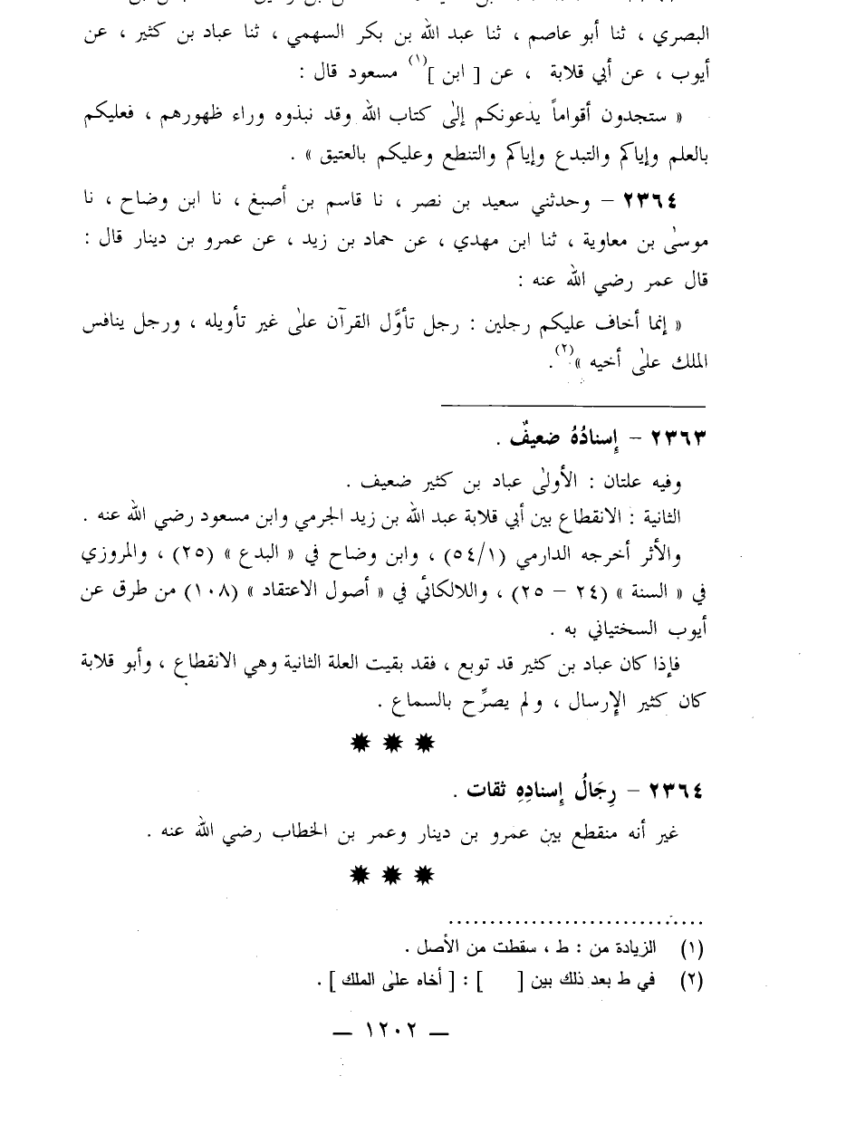 2363 - حَدَّثَنَا سَلَمَةُ بْنُ سَعِيدٍ، ثنا الْحَسَنُ بْنُ رَشِيقٍ، ثنا الْعَبَّاسُ بْنُ مُحَمَّدٍ الْبَصْرِيُّ، ثنا أَبُو عَاصِمٍ، ثنا عَبْدُ اللَّهِ بْنُ بَكْرٍ السَّهْمِيُّ، ثنا عَبَّادُ بْنُ كَثِيرٍ، عَنْ أَيُّوبَ عَنْ أَبِي قِلَابَةَ، عَنِ ابْنِ مَسْعُودٍ، قَالَ: §«سَتَجِدُونَ أَقْوَامًا يَدْعُونَكُمْ إِلَى كِتَابِ اللَّهِ وَقَدْ نَبَذُوهُ وَرَاءَ ظُهُورِهِمْ فَعَلَيْكُمْ بِالْعِلْمِ وَإِيَّاكُمْ وَالتَّبَدُّعَ وَإِيَّاكُمْ وَالتَّنَطُّعَ وَعَلَيْكُمْ بِالْعَتِيقِ»