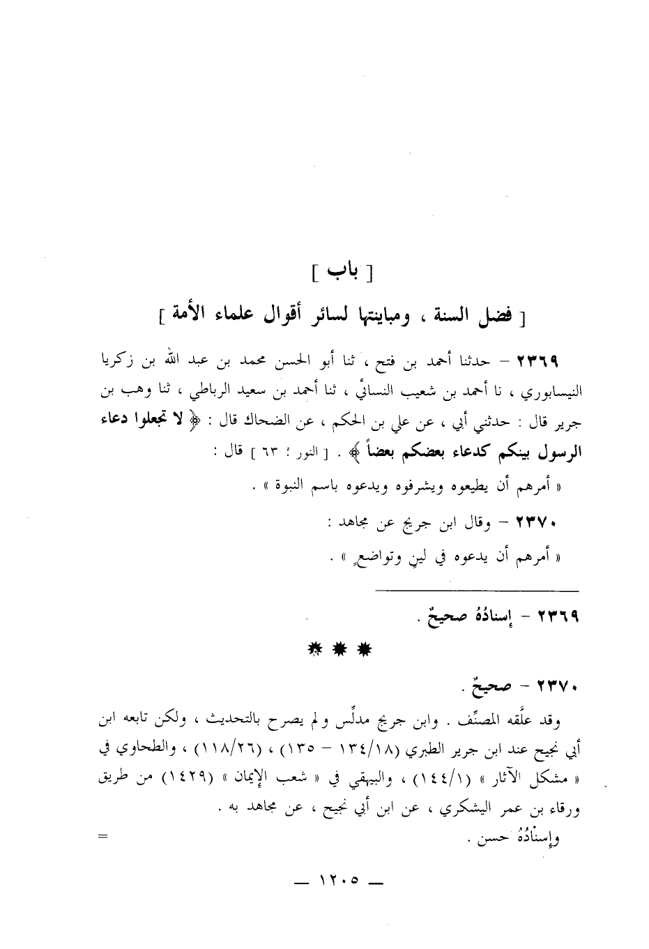 2369 - حَدَّثَنَا أَحْمَدُ بْنُ فَتْحٍ، ثنا أَبُو الْحَسَنِ مُحَمَّدُ بْنُ عَبْدِ اللَّهِ بْنِ زَكَرِيَّا النَّيْسَابُورِيُّ نا أَحْمَدُ بْنُ شُعَيْبٍ النَّسَائِيُّ، ثنا أَحْمَدُ بْنُ سَعِيدٍ الرِّبَاطِيُّ، ثنا وَهْبُ بْنُ جَرِيرٍ، قَالَ: حَدَّثَنِي أَبِي، عَنْ عَلِيِّ بْنِ الْحَكَمِ، عَنِ الضَّحَّاكِ، قَالَ: {لَا تَجْعَلُوا دُعَاءَ الرَّسُولِ بَيْنَكُمْ كَدُعَاءِ بَعْضِكُمْ بَعْضًا} [النور: 63] قَالَ: §«أَمَرَهُمْ أَنْ يُطِيعُوهُ وَيُشَرِّفُوهُ وَيَدْعُوهُ بِاسْمِ النُّبُوَّةِ»