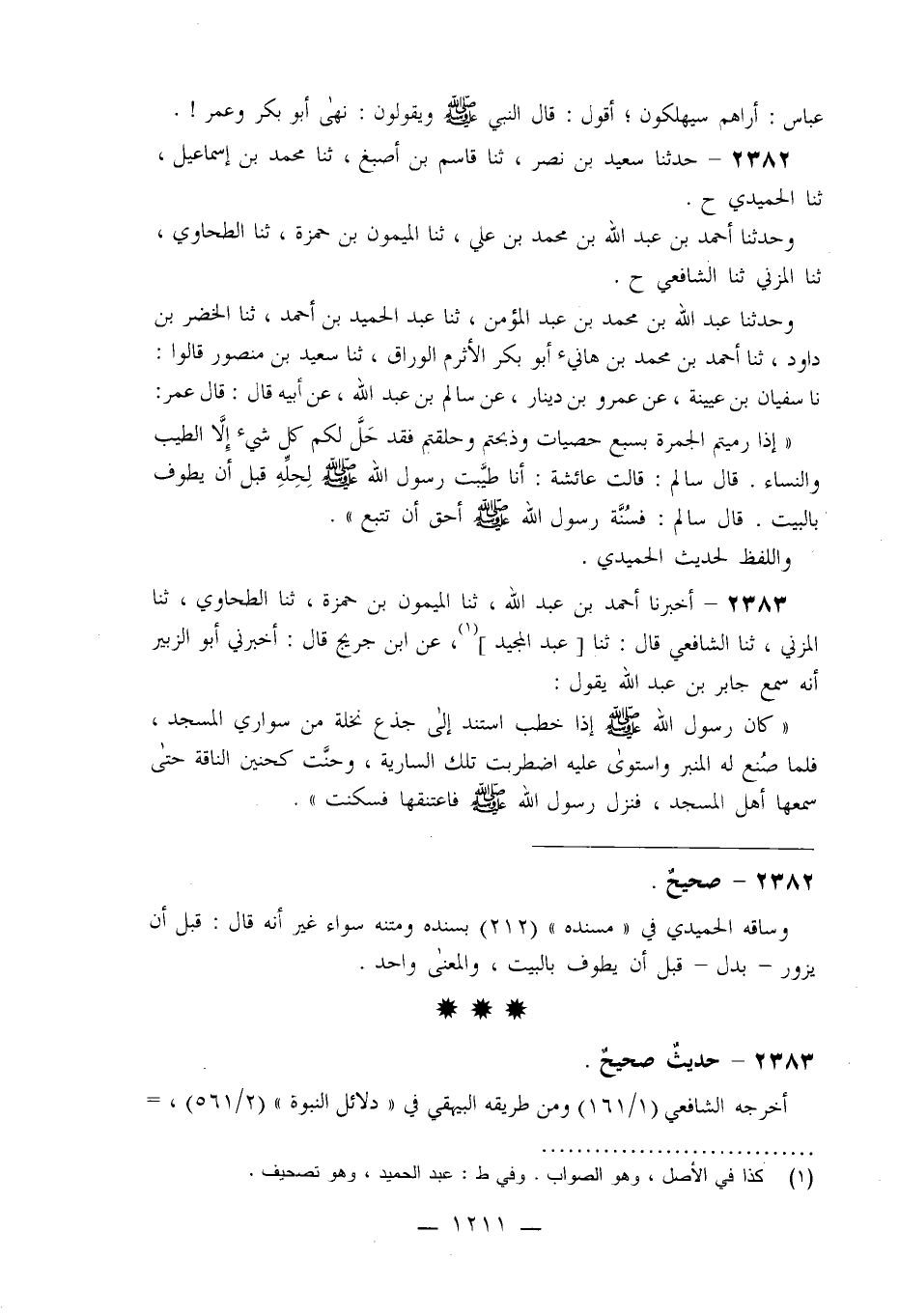 2382 - حَدَّثَنَا سَعِيدُ بْنُ نَصْرٍ، ثنا قَاسِمُ بْنُ أَصْبَغَ، ثنا مُحَمَّدُ بْنُ إِسْمَاعِيلَ، ثنا الْحُمَيْدِيُّ، ح وَحَدَّثَنَا أَحْمَدُ بْنُ عَبْدِ اللَّهِ بْنِ مُحَمَّدِ بْنِ عَلِيٍّ، ثنا الْمَيْمُونُ بْنُ حَمْزَةَ، ثنا الطَّحَاوِيُّ ثنا الْمُزَنِيُّ، ثنا الشَّافِعِيُّ، ح وَحَدَّثَنَا عَبْدُ اللَّهِ بْنُ مُحَمَّدِ بْنِ عَبْدِ الْمُؤْمِنِ، ثنا عَبْدُ الْحَمِيدِ بْنُ أَحْمَدَ، ثنا الْخَضِرُ بْنُ دَاوُدَ، ثنا أَحْمَدُ بْنُ مُحَمَّدِ بْنِ هَانِئٍ أَبُو بَكْرٍ الْأَثْرَمُ الْوَرَّاقُ، ثنا سَعِيدُ بْنُ مَنْصُورٍ، قَالُوا: نا سُفْيَانُ بْنُ عُيَيْنَةَ، عَنْ عَمْرِو بْنِ دِينَارٍ، عَنْ سَالِمِ بْنِ عَبْدِ اللَّهِ، عَنْ أَبِيهِ، قَالَ: قَالَ عُمَرُ: §" إِذَا رَمَيْتُمُ الْجَمْرَةَ بِسَبْعِ حَصَيَاتٍ وَذَبَحْتُمْ وَحَلَقْتُمْ فَقَدْ حَلَّ لَكُمْ كُلُّ شَيْءٍ إِلَّا الطِّيبَ وَالنِّسَاءَ