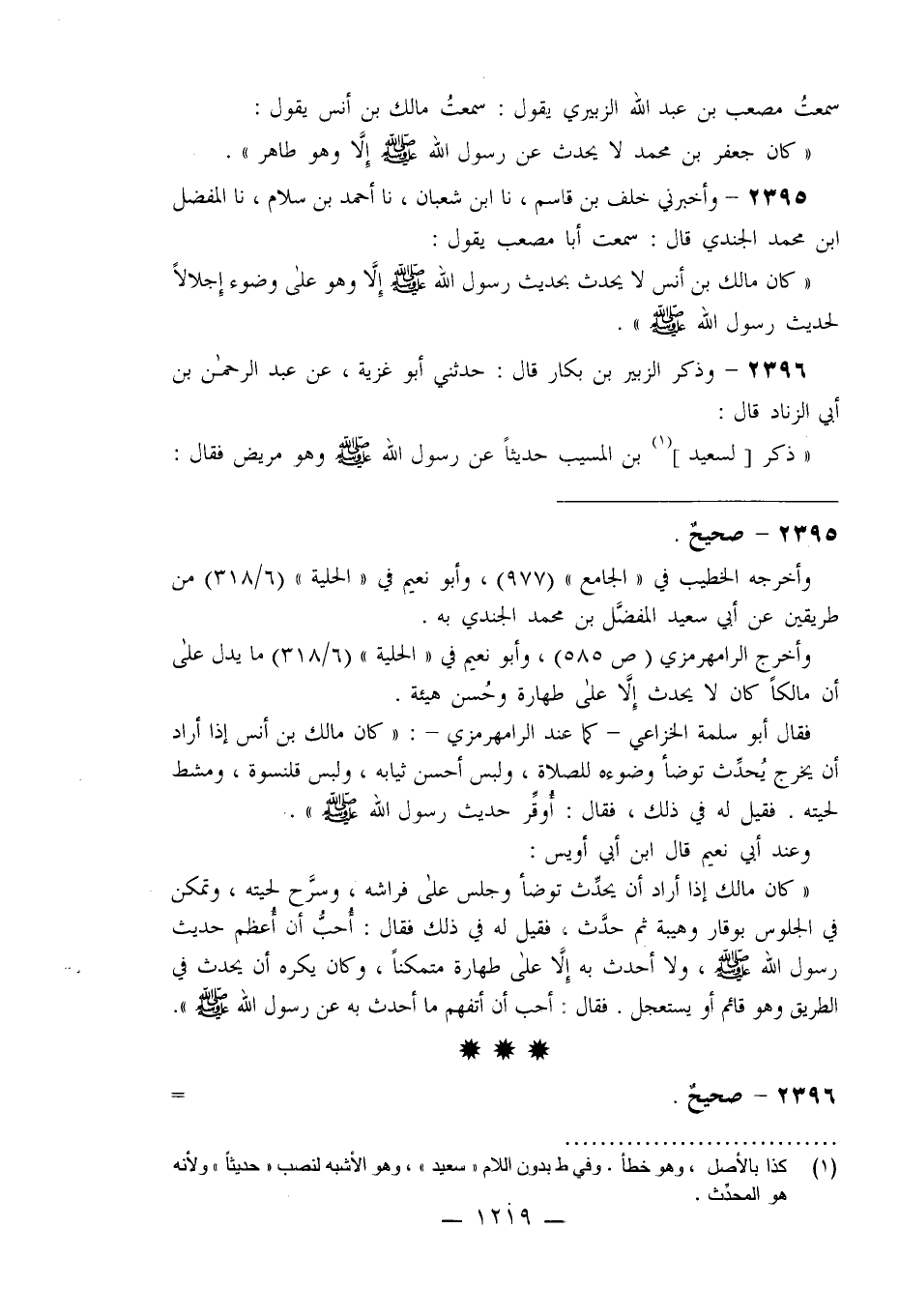 2395 - وَأَخْبَرَنِي خَلَفُ بْنُ قَاسِمٍ، نا ابْنُ شَعْبَانَ، نا أَحْمَدُ بْنُ سَلَامٍ نا الْمُفَضَّلُ بْنُ مُحَمَّدٍ الْجَنَدِيُّ، قَالَ: سَمِعْتُ أَبَا مُصْعَبٍ، يَقُولُ: §«كَانَ مَالِكُ بْنُ أَنَسٍ لَا يُحَدِّثُ بِحَدِيثِ رَسُولِ اللَّهِ صَلَّى اللَّهُ عَلَيْهِ وَسَلَّمَ إِلَّا وَهُوَ عَلَى وُضُوءٍ إِجْلَالًا لِحَدِيثِ رَسُولِ اللَّهِ صَلَّى اللَّهُ عَلَيْهِ»