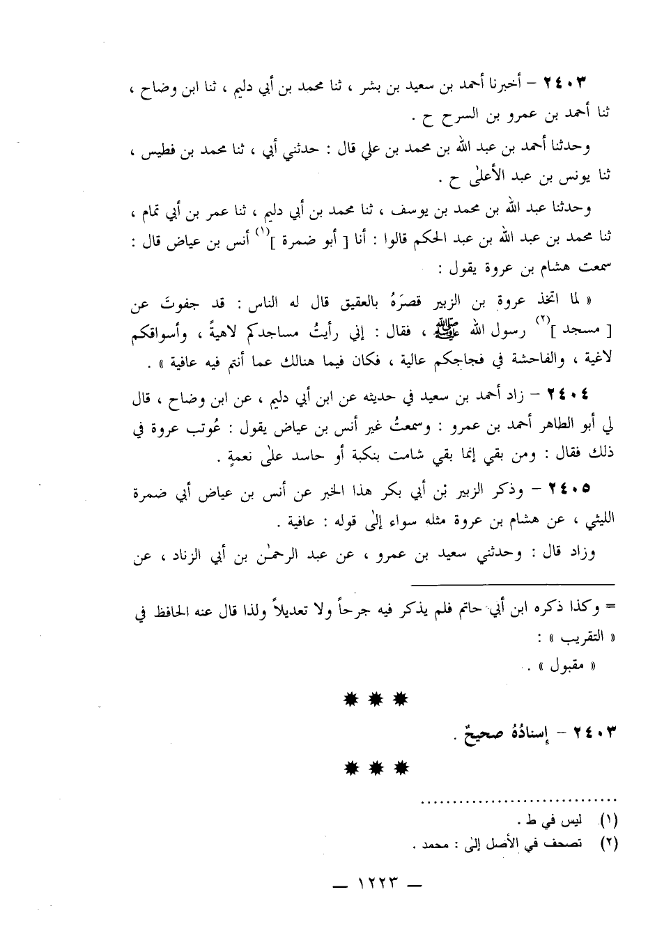 2403 - أَخْبَرَنَا أَحْمَدُ بْنُ سَعِيدِ بْنِ بِشْرٍ، ثنا مُحَمَّدُ بْنُ أَبِي دُلَيْمٍ، ثنا ابْنُ وَضَّاحٍ، ثنا أَحْمَدُ بْنُ عَمْرِو بْنِ السَّرْحِ، ح وَحَدَّثَنَا أَحْمَدُ بْنُ عَبْدِ اللَّهِ بْنِ مُحَمَّدِ بْنِ عَلِيٍّ، قَالَ: حَدَّثَنِي أَبِي ثنا مُحَمَّدُ بْنُ فُطَيْسٍ، ثنا يُونُسُ بْنُ عَبْدِ الْأَعْلَى، ح وَحَدَّثَنَا عَبْدُ اللَّهِ بْنُ مُحَمَّدِ بْنِ يُوسُفَ، ثنا مُحَمَّدُ بْنُ أَبِي دُلَيْمٍ، ثنا عُمَرُ بْنُ أَبِي تَمَّامٍ ثنا مُحَمَّدُ بْنُ عَبْدِ اللَّهِ بْنِ عَبْدِ الْحَكَمِ، قَالُوا أنا أَبُو ضَمْرَةَ أَنَسُ بْنُ عِيَاضٍ، قَالَ: سَمِعْتُ هِشَامَ بْنَ عُرْوَةَ، يَقُولُ: §" لَمَّا اتَّخَذَ عُرْوَةُ بْنُ الزُّبَيْرِ قَصْرَهُ بِالْعَقِيقِ قَالَ لَهُ النَّاسُ: قَدْ جَفَوْتَ عَنْ مَسْجِدِ رَسُولِ اللَّهِ صَلَّى اللَّهُ عَلَيْهِ وَسَلَّمَ فَقَالَ: إِنِّي رَأَيْتُ مَسَاجِدَكُمْ لَاهِيَةً وَأَسْوَاقَكُمْ لَاغِيَةً وَالْفَاحِشَةَ فِي فِجَاجِكُمْ عَالِيَةً، فَكَانَ فِيمَا هُنَالِكَ عَمَّا أَنْتُمْ فِيهِ عَافِيَةٌ،