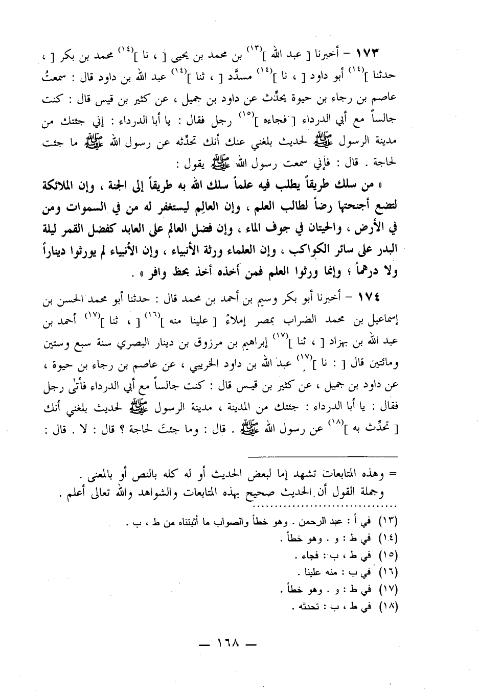 174 - أَخْبَرَنَا أَبُو بَكْرٍ، وَسِيمُ بْنُ أَحْمَدَ بْنِ مُحَمَّدٍ قَالَ: حَدَّثَنَا أَبُو مُحَمَّدٍ الْحَسَنُ بْنُ إِسْمَاعِيلَ بْنِ مُحَمَّدٍ الضَّرَّابُ بِمِصْرَ إِمْلَاءً عَلَيْنَا مِنْهُ، ثنا أَحْمَدُ بْنُ عَبْدِ اللَّهِ بْنِ بَهْزَادَ، ثنا إِبْرَاهِيمُ بْنُ مَرْزُوقِ بْنِ دِينَارٍ الْبَصْرِيُّ سَنَةَ سَبْعٍ وَسِتِّينَ وَمِائَتَيْنِ، قَالَ: نا عَبْدُ اللَّهِ بْنُ دَاوُدَ الْخُرَيْبِيُّ، عَنْ عَاصِمِ بْنِ رَجَاءِ بْنِ حَيْوَةَ، عَنْ دَاوُدَ بْنِ جَمِيلٍ، عَنْ كَثِيرِ بْنِ قَيْسٍ قَالَ: كُنْتُ جَالِسًا مَعَ أَبِي الدَّرْدَاءِ فَأَتَى رَجُلٌ، فَقَالَ: يَا أَبَا الدَّرْدَاءِ جِئْتُكَ مِنَ الْمَدِينَةِ مَدِينَةِ الرَّسُولِ صَلَّى اللَّهُ عَلَيْهِ وَسَلَّمَ لِحَدِيثٍ بَلَغَنِي أَنَّكَ تُحَدِّثُ بِهِ عَنْ رَسُولِ اللَّهِ صَلَّى اللَّهُ عَلَيْهِ وَسَلَّمَ قَالَ: وَمَا جِئْتَ لِحَاجَةٍ؟ قَالَ: لَا قَالَ: -[169]- وَلَا لِتِجَارَةٍ؟ قَالَ: لَا قَالَ: وَلَا جِئْتَ إِلَّا لِهَذَا؟ قَالَ: نَعَمْ، قَالَ: فَإِنِّي سَمِعْتُ رَسُولَ اللَّهِ صَلَّى اللَّهُ عَلَيْهِ وَسَلَّمَ يَقُولُ: §«مَنْ سَلَكَ طَرِيقًا يَلْتَمِسُ فِيهِ عِلْمًا سَلَكَ اللَّهُ بِهِ طَرِيقًا مِنْ طُرُقِ الْجَنَّةِ، وَإِنَّ الْمَلَائِكَةَ لَتَضَعُ أَجْنِحَتَهَا لِطَالِبِ الْعِلْمِ وَإِنَّ فَضْلَ الْعَالِمِ عَلَى الْعَابِدِ كَفَضْلِ الْقَمَرِ لَيْلَةَ الْبَدْرِ عَلَى سَائِرِ الْكَوَاكِبِ، وَإِنَّ الْعَالِمَ لَيَسْتَغْفِرُ لَهُ مَنْ فِي السَّمَوَاتِ وَمَنْ فِي الْأَرْضِ وَكُلُّ شَيْءٍ حَتَّى الْحِيتَانُ فِي جَوْفِ الْمَاءِ، وَإِنَّ الْعُلَمَاءَ وَرَثَةُ الْأَنْبِيَاءِ، إِنَّ الْأَنْبِيَاءَ لَمْ يُوَرِّثُوا دِينَارًا وَلَا دِرْهَمًا، وَإِنَّمَا وَرَّثُوا الْعِلْمَ، فَمَنْ أَخَذَ بِهِ أَخَذَ بِحَظٍّ وَافِرٍ»
