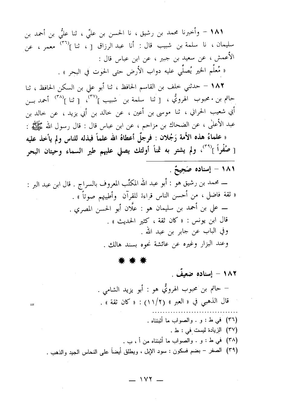 181 - وَأَخْبَرَنَا مُحَمَّدُ بْنُ رَشِيقٍ، نا الْحَسَنُ بْنُ عَلِيٍّ، ثنا عَلِيُّ بْنُ أَحْمَدَ بْنِ سُلَيْمَانَ، نا سَلَمَةُ بْنُ شَبِيبٍ قَالَ: أنا عَبْدُ الرَّزَّاقِ، ثنا مَعْمَرٌ، عَنِ الْأَعْمَشِ، عَنْ سَعِيدِ بْنِ جُبَيْرٍ، عَنِ ابْنِ عَبَّاسٍ قَالَ: §«مُعَلِّمُ الْخَيْرِ يُصَلِّي عَلَيْهِ دَوَابُّ الْأَرْضِ حَتَّى الْحُوتُ فِي الْبَحْرِ»