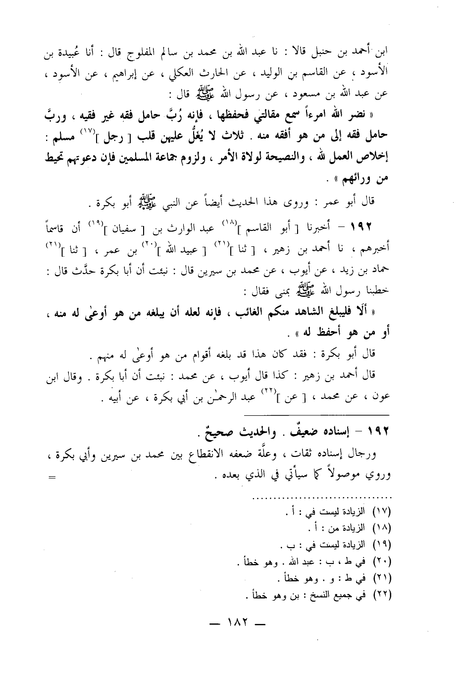 192 - أَخْبَرَنَا أَبُو الْقَاسِمِ عَبْدُ الْوَارِثِ بْنُ سُفْيَانَ، أَنَّ قَاسِمًا، أَخْبَرَهُمْ نا أَحْمَدُ بْنُ زُهَيْرٍ، ثنا عُبَيْدُ اللَّهِ بْنُ عُمَرَ، ثنا حَمَّادُ بْنُ زَيْدٍ، عَنْ أَيُّوبَ، عَنْ مُحَمَّدِ بْنِ سِيرِينَ قَالَ: نُبِّئْتُ أَنَّ أَبَا بَكْرَةَ، حَدَّثَ قَالَ: خَطَبَنَا رَسُولُ اللَّهِ صَلَّى اللَّهُ عَلَيْهِ وَسَلَّمَ بِمِنًى فَقَالَ: §«أَلَا فَلْيُبَلِّغِ الشَّاهِدُ مِنْكُمُ الْغَائِبَ فَإِنَّهُ لَعَلَّهُ أَنْ يُبَلِّغَهُ مَنْ هُوَ أَوْعَى لَهُ مِنْهُ أَوْ مَنْ هُوَ أَحْفَظُ لَهُ» قَالَ أَبُو بَكْرَةَ: فَقَدْ كَانَ هَذَا قَدْ بَلَّغَهُ أَقْوَامٌ مَنْ هُوَ أَوْعَى لَهُ مِنْهُمْ , قَالَ أَحْمَدُ بْنُ زُهَيْرٍ: كَذَا قَالَ أَيُّوبُ، عَنْ مُحَمَّدٍ: نُبِّئْتُ أَنَّ أَبَا بَكْرَةَ، وَقَالَ ابْنُ عَوْنٍ، عَنْ مُحَمَّدِ , عَنْ عَبْدِ الرَّحْمَنِ بْنِ أَبِي بَكْرَةَ، عَنْ أَبِيهِ