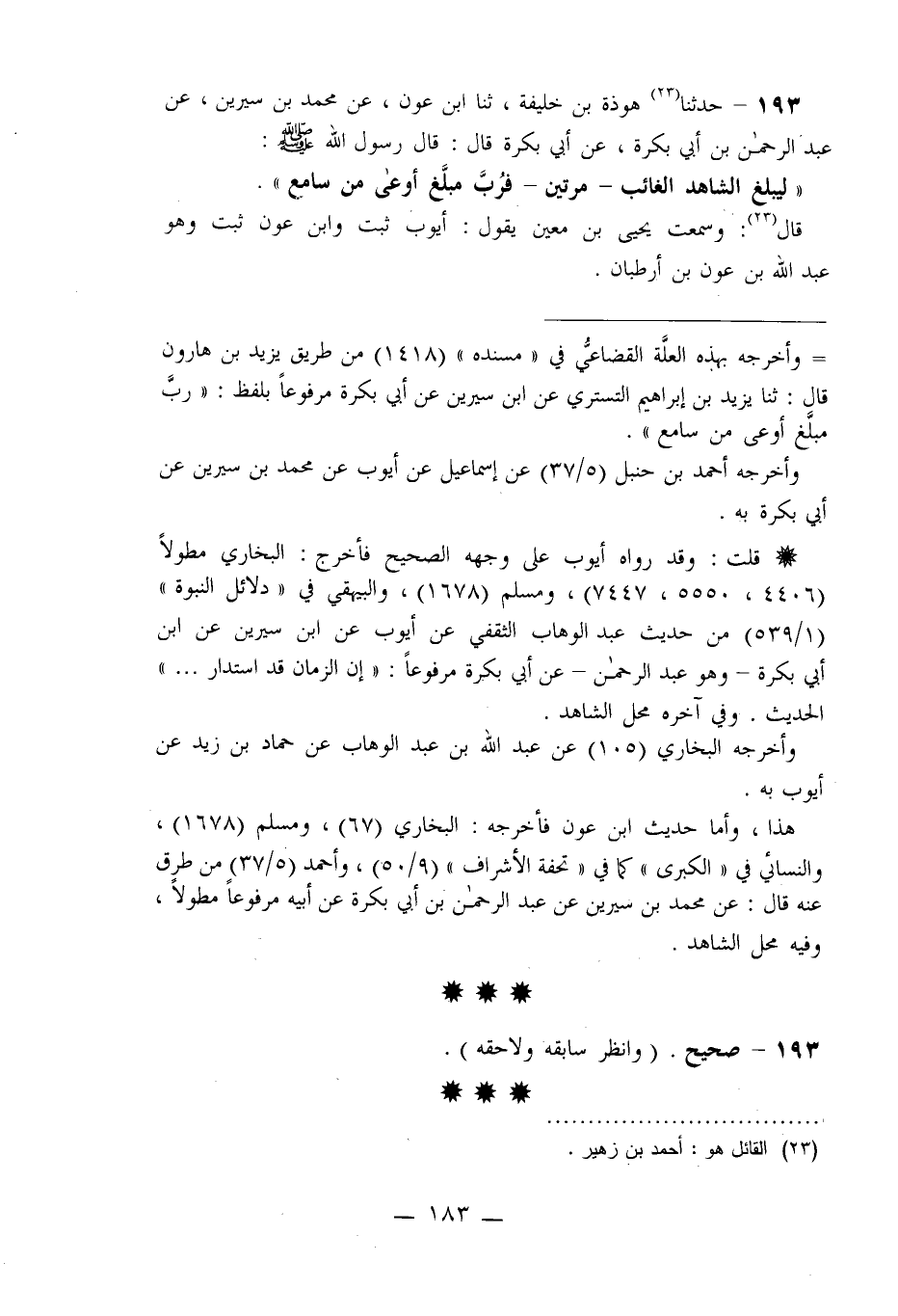 193 - حَدَّثَنَا هَوْذَةُ بْنُ خَلِيفَةَ، ثنا ابْنُ عَوْنٍ، عَنْ مُحَمَّدِ بْنِ سِيرِينَ، عَنْ عَبْدِ الرَّحْمَنِ بْنِ أَبِي بَكْرَةَ، عَنْ أَبِي بَكْرَةَ قَالَ: قَالَ رَسُولُ اللَّهِ صَلَّى اللَّهُ عَلَيْهِ وَسَلَّمَ: «§لِيُبَلِّغِ الشَّاهِدُ الْغَائِبَ - مَرَّتَيْنِ -، فَرُبَّ مُبَلَّغٍ أَوْعَى مِنْ سَامِعٍ» قَالَ: وَسَمِعْتُ يَحْيَى بْنَ مَعِينٍ يَقُولُ: أَيُّوبُ ثَبْتٌ، وَابْنُ عَوْنٍ ثَبْتٌ وَهُوَ عَبْدُ اللَّهِ بْنُ عَوْنِ بْنِ أَرْطَبَانَ