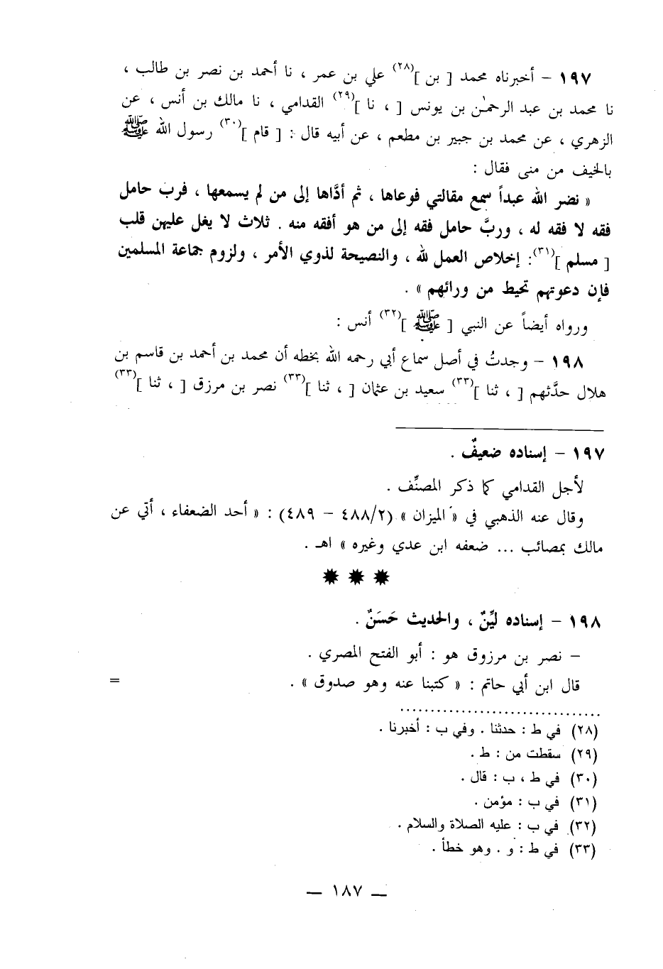 197 - أَخْبَرَنَاهُ مُحَمَّدُ بْنُ عَلِيِّ بْنِ عُمَرَ، نا أَحْمَدُ بْنُ نَصْرِ بْنِ طَالِبٍ، نا مُحَمَّدُ بْنُ عَبْدِ الرَّحْمَنِ بْنِ يُونُسَ، نا الْقُدَّامِيُّ، نا مَالِكُ بْنُ أَنَسٍ، عَنِ الزُّهْرِيِّ، عَنْ مُحَمَّدِ بْنِ جُبَيْرِ بْنِ مُطْعِمٍ، عَنْ أَبِيهِ قَالَ: قَامَ رَسُولُ اللَّهِ صَلَّى اللَّهُ عَلَيْهِ وَسَلَّمَ بِالْخَيْفِ مِنْ مِنًى، فَقَالَ: §" نَضَّرَ اللَّهُ عَبْدًا سَمِعَ مَقَالَتِي فَوَعَاهَا، ثُمَّ أَدَّاهَا إِلَى مَنْ لَمْ يَسْمَعْهَا فَرُبَّ حَامِلِ فِقْهٍ لَا فِقْهَ لَهُ، وَرُبَّ حَامِلِ فِقْهٍ إِلَى مَنْ هُوَ أَفْقَهُ مِنْهُ، ثَلَاثٌ لَا يُغِلُّ عَلَيْهِنَّ قَلْبُ مُسْلِمٍ: إِخْلَاصُ الْعَمَلِ لِلَّهِ وَالنَّصِيحَةُ لِذَوِي الْأَمْرِ وَلُزُومُ جَمَاعَةِ الْمُسْلِمِينَ؛ فَإِنَّ دَعْوَتَهُمْ تُحِيطُ مِنْ وَرَائِهِمْ " وَرَوَاهُ أَيْضًا عَنِ النَّبِيِّ صَلَّى اللَّهُ عَلَيْهِ وَسَلَّمَ أَنَسٌ