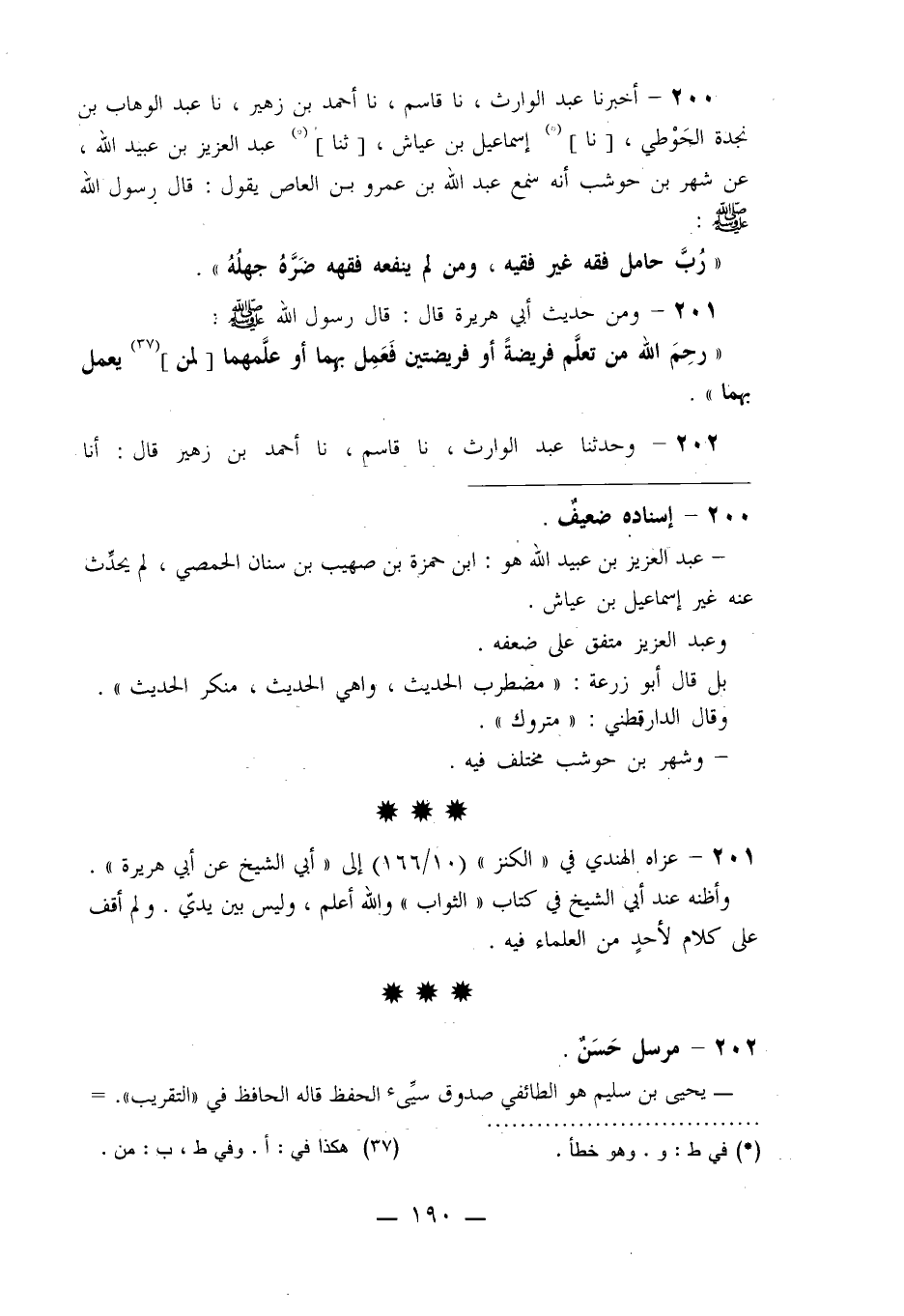 200 - أَخْبَرَنَا عَبْدُ الْوَارِثِ، نا قَاسِمٌ، نا أَحْمَدُ بْنُ زُهَيْرٍ، نا عَبْدُ الْوَهَّابِ بْنُ نَجْدَةَ الْحَوْطِيُّ، نا إِسْمَاعِيلُ بْنُ عَيَّاشٍ، ثنا عَبْدُ الْعَزِيزِ بْنُ عُبَيْدِ اللَّهِ، عَنْ شَهْرِ بْنِ حَوْشَبٍ، أَنَّهُ سَمِعَ عَبْدَ اللَّهِ بْنَ عَمْرِو بْنِ الْعَاصِ يَقُولُ: قَالَ رَسُولُ اللَّهِ صَلَّى اللَّهُ عَلَيْهِ وَسَلَّمَ: «§رُبَّ حَامِلِ فِقْهٍ غَيْرُ فَقِيهٍ، وَمَنْ لَمْ يَنْفَعْهُ فِقْهُهُ ضَرَّهُ جَهْلُهُ»
