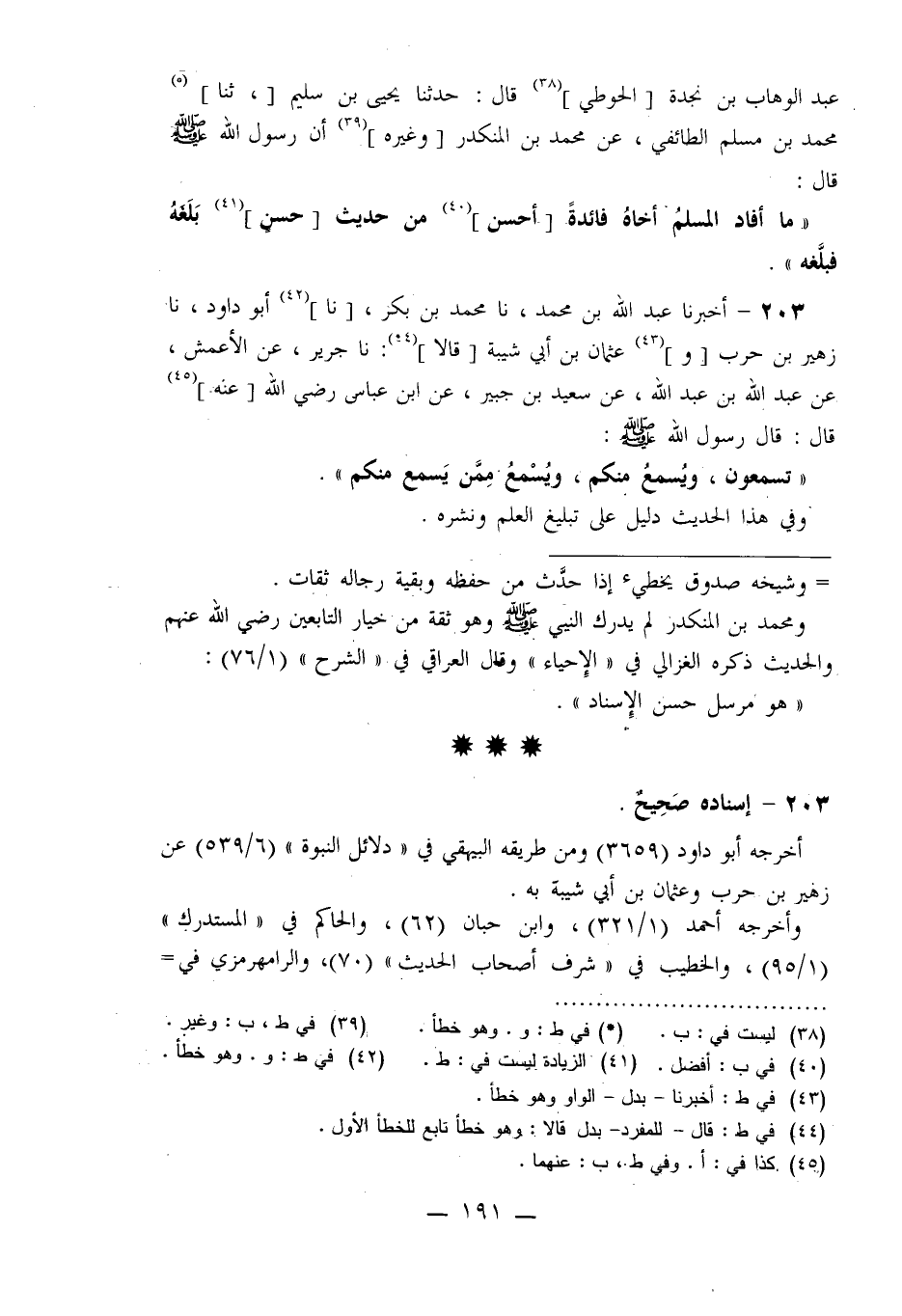 203 - أَخْبَرَنَا عَبْدُ اللَّهِ بْنُ مُحَمَّدٍ، نا مُحَمَّدُ بْنُ بَكْرٍ، نا أَبُو دَاوُدَ، نا زُهَيْرُ بْنُ حَرْبٍ، وَعُثْمَانُ بْنُ أَبِي شَيْبَةَ قَالَا: نا جَرِيرٌ، عَنِ الْأَعْمَشِ، عَنْ عَبْدِ اللَّهِ بْنِ عَبْدِ اللَّهِ، عَنْ سَعِيدِ بْنِ جُبَيْرٍ، عَنِ ابْنِ عَبَّاسٍ رَضِيَ اللَّهُ عَنْهُ قَالَ: قَالَ رَسُولُ اللَّهِ صَلَّى اللَّهُ عَلَيْهِ وَسَلَّمَ: §«تَسْمَعُونَ وَيُسْمَعُ مِنْكُمْ وَيُسْمَعُ مِمَّنْ يَسْمَعُ مِنْكُمْ» وَفِي هَذَا الْحَدِيثِ دَلِيلٌ عَلَى تَبْلِيغِ الْعِلْمِ وَنَشْرِهِ