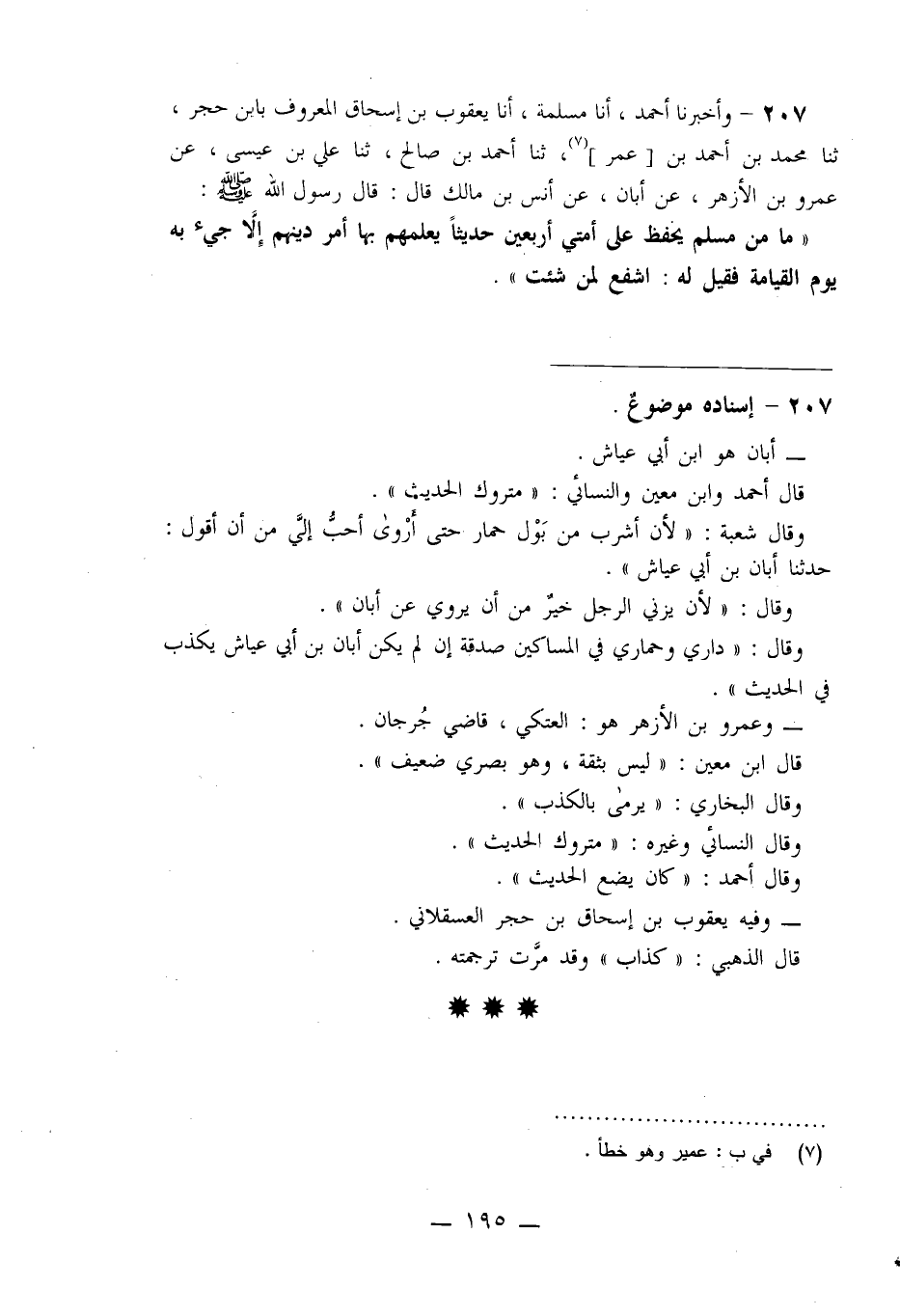 207 - وَأَخْبَرَنَا أَحْمَدُ، أنا مَسْلَمَةُ، أنا يَعْقُوبُ بْنُ إِسْحَاقَ الْمَعْرُوفُ بِابْنِ حَجَرٍ، ثنا مُحَمَّدُ بْنُ أَحْمَدَ بْنِ عُمَرَ، ثنا أَحْمَدُ بْنُ صَالِحٍ، ثنا عَلِيُّ بْنُ عِيسَى، عَنْ عَمْرِو بْنِ الْأَزْهَرِ، عَنْ أَبَانَ، عَنْ أَنَسِ بْنِ مَالِكٍ قَالَ: قَالَ رَسُولُ اللَّهِ صَلَّى اللَّهُ عَلَيْهِ وَسَلَّمَ: §" مَا مِنْ مُسْلِمٍ يَحْفَظُ عَلَى أُمَّتِي أَرْبَعِينَ حَدِيثًا يُعَلِّمُهُمْ بِهَا أَمْرَ دِينِهِمْ إِلَّا جِيءَ بِهِ يَوْمَ الْقِيَامَةِ فَقِيلَ لَهُ: اشْفَعْ لِمَنْ شِئْتَ "