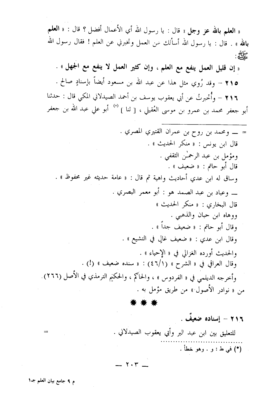 216 - وَأُخْبِرْتُ عَنْ أَبِي يَعْقُوبَ يُوسُفَ بْنِ أَحْمَدَ الصَّيْدَلَانِيِّ الْمَكِّيِّ قَالَ: حَدَّثَنَا أَبُو جَعْفَرٍ مُحَمَّدُ بْنُ عَمْرِو بْنِ مُوسَى الْعُقَيْلِيُّ، ثنا أَبُو عَلِيٍّ عَبْدُ اللَّهِ بْنُ جَعْفَرٍ -[204]- الرَّازِيُّ، ثنا مُحَمَّدُ بْنُ سَمَاعَةَ، عَنْ أَبِي يُوسُفَ قَالَ: سَمِعْتُ أَبَا حَنِيفَةَ رَحِمَهُ اللَّهُ يَقُولُ: " حَجَجْتُ مَعَ أَبِي سَنَةَ ثَلَاثٍ وَتِسْعِينَ وَلِيَ سِتَّ عَشْرَةَ سَنَةً فَإِذَا شَيْخٌ قَدِ اجْتَمَعَ النَّاسُ عَلَيْهِ فَقُلْتُ لِأَبِي: مَنْ هَذَا الشَّيْخُ؟ فَقَالَ: هَذَا رَجُلٌ قَدْ صَحِبَ النَّبِيَّ صَلَّى اللَّهُ عَلَيْهِ وَسَلَّمَ يُقَالُ لَهُ عَبْدُ اللَّهِ بْنُ الْحَارِثِ بْنِ جَزْءٍ، فَقُلْتُ لِأَبِي: فَأَيُّ شَيْءٍ عِنْدَهُ؟ قَالَ: أَحَادِيثُ سَمِعَهَا مِنْ رَسُولِ اللَّهِ صَلَّى اللَّهُ عَلَيْهِ وَسَلَّمَ فَقُلْتُ لِأَبِي: قَدِّمْنِي إِلَيْهِ حَتَّى أَسْمَعَ مِنْهُ، فَتَقَدَّمَ بَيْنَ يَدَيَّ وَجَعَلَ يُفَرِّجُ النَّاسَ حَتَّى دَنَوْتُ مِنْهُ فَسَمِعْتُهُ يَقُولُ: قَالَ رَسُولُ اللَّهِ صَلَّى اللَّهُ عَلَيْهِ وَسَلَّمَ: §«مِنْ تَفَقَّهَ فِي دِينِ اللَّهِ كَفَاهُ اللَّهُ هَمَّهُ وَرَزَقَهُ مِنْ حَيْثُ لَا يَحْتَسِبُ» قَالَ أَبُو عُمَرَ: ذَكَرَ مُحَمَّدُ بْنُ سَعْدٍ كَاتِبُ الْوَاقِدِيِّ أَنَّ أَبَا حَنِيفَةَ رَأَى أَنَسَ بْنَ مَالِكٍ، وَعَبْدَ اللَّهِ بْنَ الْحَارِثِ بْنِ جَزْءٍ الزُّبَيْدِيَّ