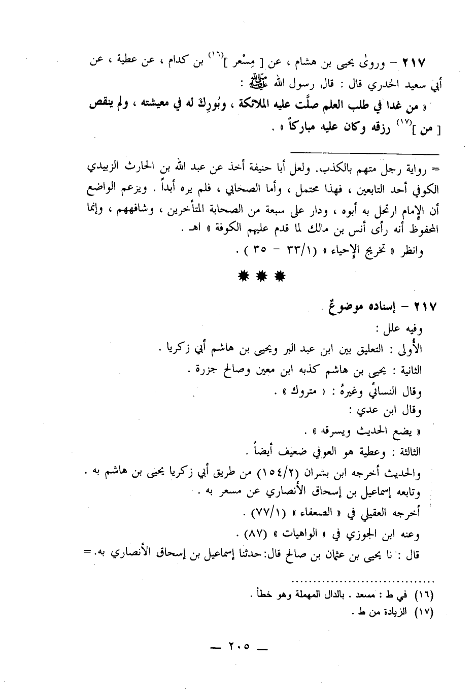 217 - وَرَوَى يَحْيَى بْنُ هَاشِمٍ، عَنْ مِسْعَرِ بْنِ كِدَامٍ، عَنْ عَطِيَّةَ، عَنْ أَبِي سَعِيدٍ الْخُدْرِيِّ قَالَ: قَالَ رَسُولُ اللَّهِ صَلَّى اللَّهُ عَلَيْهِ وَسَلَّمَ: §«مَنْ غَدَا فِي طَلَبِ الْعِلْمِ صَلَّتْ عَلَيْهِ الْمَلَائِكَةُ وَبُورِكَ لَهُ فِي مَعِيشَتِهِ وَلَمْ يُنْقَصْ مِنْ رِزْقِهِ وَكَانَ عَلَيْهِ مُبَارَكًا»