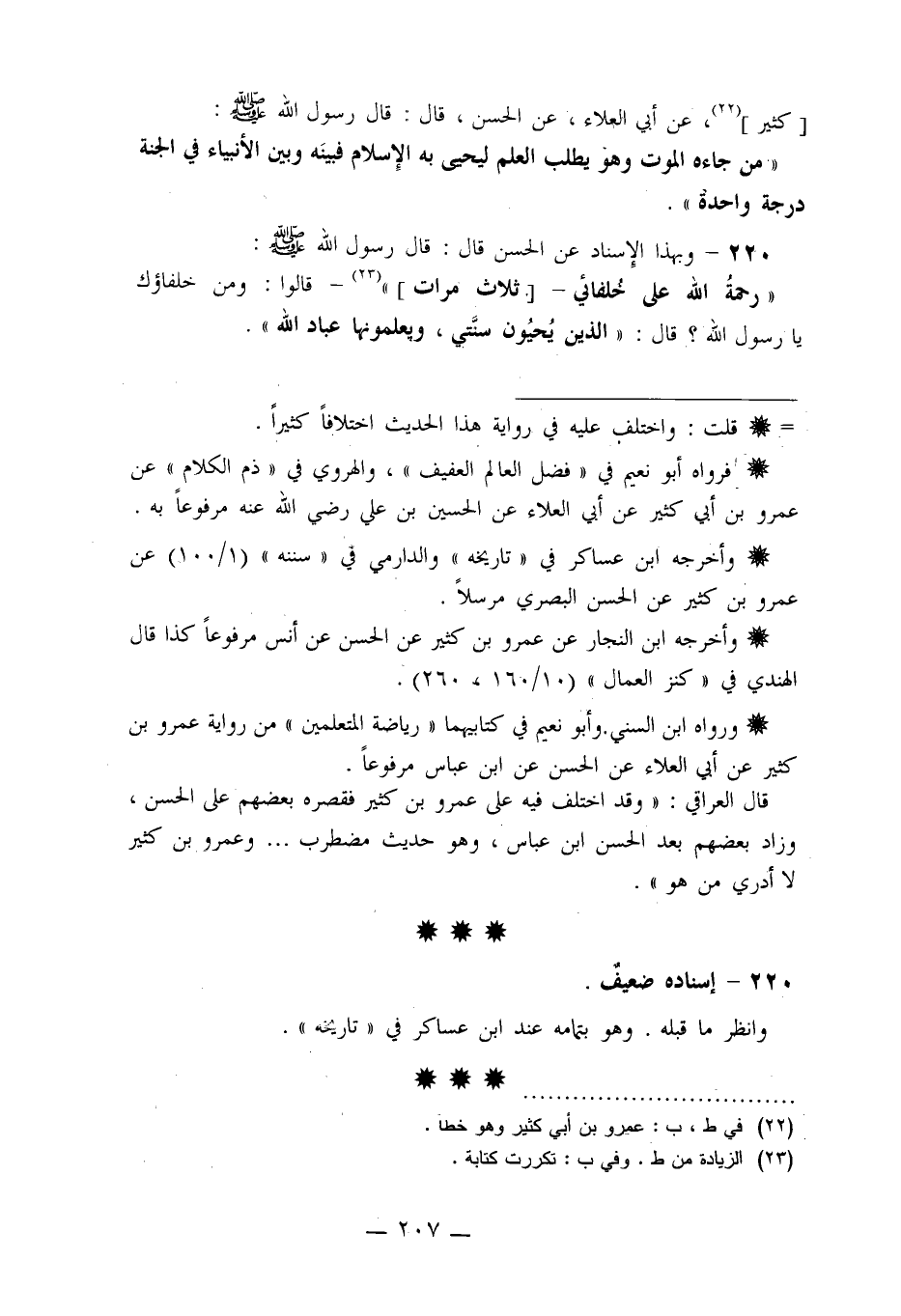 220 - وَبِهَذَا الْإِسْنَادِ عَنِ الْحَسَنِ قَالَ: قَالَ رَسُولُ اللَّهِ صَلَّى اللَّهُ عَلَيْهِ وَسَلَّمَ: «§رَحْمَةُ اللَّهِ عَلَى خُلَفَائِي» ثَلَاثَ مَرَّاتٍ قَالُوا: وَمَنْ خُلَفَاؤُكَ يَا رَسُولَ اللَّهِ؟ قَالَ: «الَّذِينَ يُحْيُونَ سُنَّتِي وَيُعَلِّمُونَهَا عِبَادَ اللَّهِ» . -[208]-