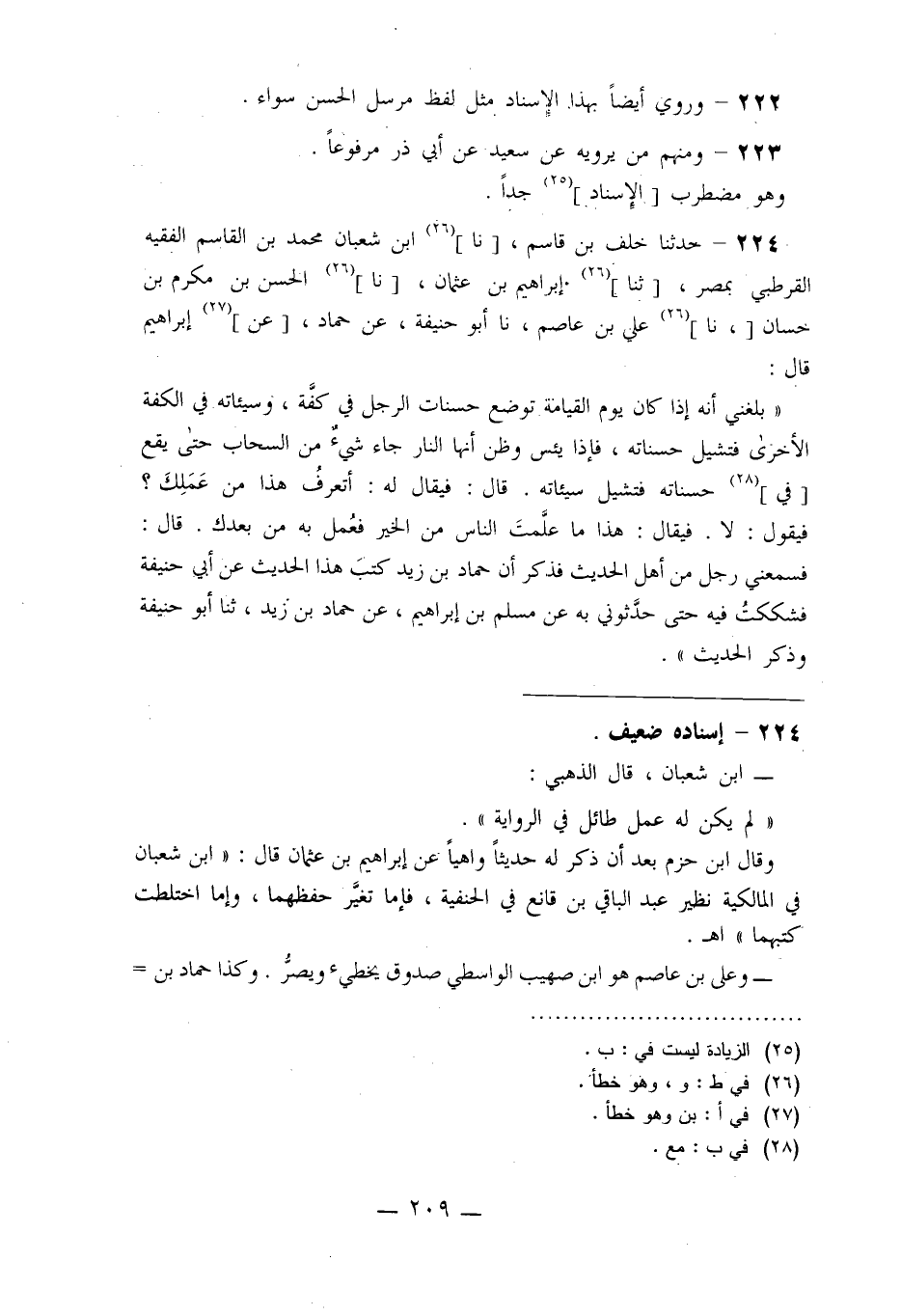 224 - حَدَّثَنَا خَلَفُ بْنُ قَاسِمٍ، نا ابْنُ شَعْبَانَ مُحَمَّدُ بْنُ الْقَاسِمِ الْفَقِيهُ الْقُرْطُبِيُّ بِمِصْرَ، ثنا إِبْرَاهِيمُ بْنُ عُثْمَانَ، نا الْحَسَنُ بْنُ مُكْرَمِ بْنِ حَسَّانَ، نا عَلِيُّ بْنُ عَاصِمٍ، نا أَبُو حَنِيفَةَ، عَنْ حَمَّادٍ، عَنْ إِبْرَاهِيمَ قَالَ: " بَلَغَنِي أَنَّهُ §إِذَا كَانَ يَوْمُ الْقِيَامَةِ تُوضَعُ حَسَنَاتُ الرَّجُلِ فِي كِفَّةٍ وَسَيِّئَاتُهُ فِي الْكِفَّةِ الْأُخْرَى فَتَشِيلُ حَسَنَاتُهُ فَإِذَا يَئِسَ وَظَنَّ أَنَّهَا النَّارُ جَاءَ شَيْءٌ مِنَ السَّحَابِ حَتَّى يَقَعَ فِي حَسَنَاتِهِ فَتَشِيلُ سَيِّئَاتُهُ قَالَ: فَيُقَالُ لَهُ: أَتَعْرِفُ هَذَا مِنْ عَمَلِكَ؟ فَيَقُولُ: لَا، فَيُقَالُ: هَذَا مَا عَلَّمْتَ النَّاسَ مِنَ الْخَيْرِ فَعُمِلَ بِهِ مِنْ بَعْدِكَ ". قَالَ: فَسَمِعَنِي رَجُلٌ مِنْ أَهْلِ الْحَدِيثِ فَذَكَرَ أَنَّ حَمَّادَ بْنَ زَيْدٍ كَتَبَ هَذَا الْحَدِيثَ، عَنْ أَبِي حَنِيفَةَ فَشَكَكْتُ فِيهِ حَتَّى حَدِّثُونِي بِهِ عَنْ مُسْلِمِ بْنِ إِبْرَاهِيمَ، عَنْ حَمَّادِ بْنِ زَيْدٍ ثنا أَبُو حَنِيفَةَ وَذَكَرَ الْحَدِيثَ
