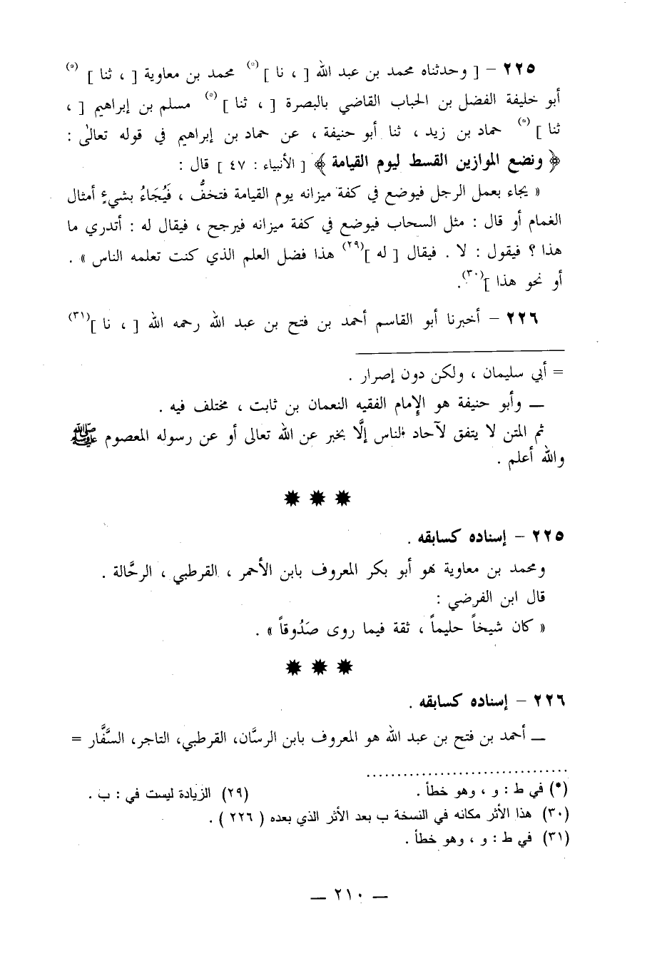 225 - وَحَدَّثَنَاهُ مُحَمَّدُ بْنُ عَبْدِ اللَّهِ، نا مُحَمَّدُ بْنُ مُعَاوِيَةَ، ثنا أَبُو خَلِيفَةَ الْفَضْلُ بْنُ الْحُبَابِ الْقَاضِي بِالْبَصْرَةِ، ثنا مُسْلِمُ بْنُ إِبْرَاهِيمَ، ثنا حَمَّادُ بْنُ زَيْدٍ، ثنا أَبُو حَنِيفَةَ، عَنْ حَمَّادِ بْنِ إِبْرَاهِيمَ فِي قَوْلِهِ تَعَالَى {§وَنَضَعُ الْمَوَازِينَ الْقِسْطَ لِيَوْمِ الْقِيَامَةِ} [الأنبياء: 47] قَالَ: " يُجَاءُ بِعَمَلِ الرَّجُلِ فَيُوضَعُ فِي كِفَّةِ مِيزَانِهِ يَوْمَ الْقِيَامَةِ فَتَخِفُّ فَيُجَاءُ بِشَيْءٍ أَمْثَالِ الْغَمَامِ أَوْ قَالَ: مِثْلِ السَّحَابِ، فَيُوضَعُ فِي كِفَّةِ مِيزَانِهِ فَيَرْجَحُ فَيُقَالُ لَهُ: أَتَدْرِي مَا هَذَا؟ فَيَقُولُ: لَا، فَيُقَالُ لَهُ: هَذَا فَضْلُ الْعِلْمِ الَّذِي كُنْتَ تُعَلِّمُهُ النَّاسَ "، أَوْ نَحْوُ هَذَا