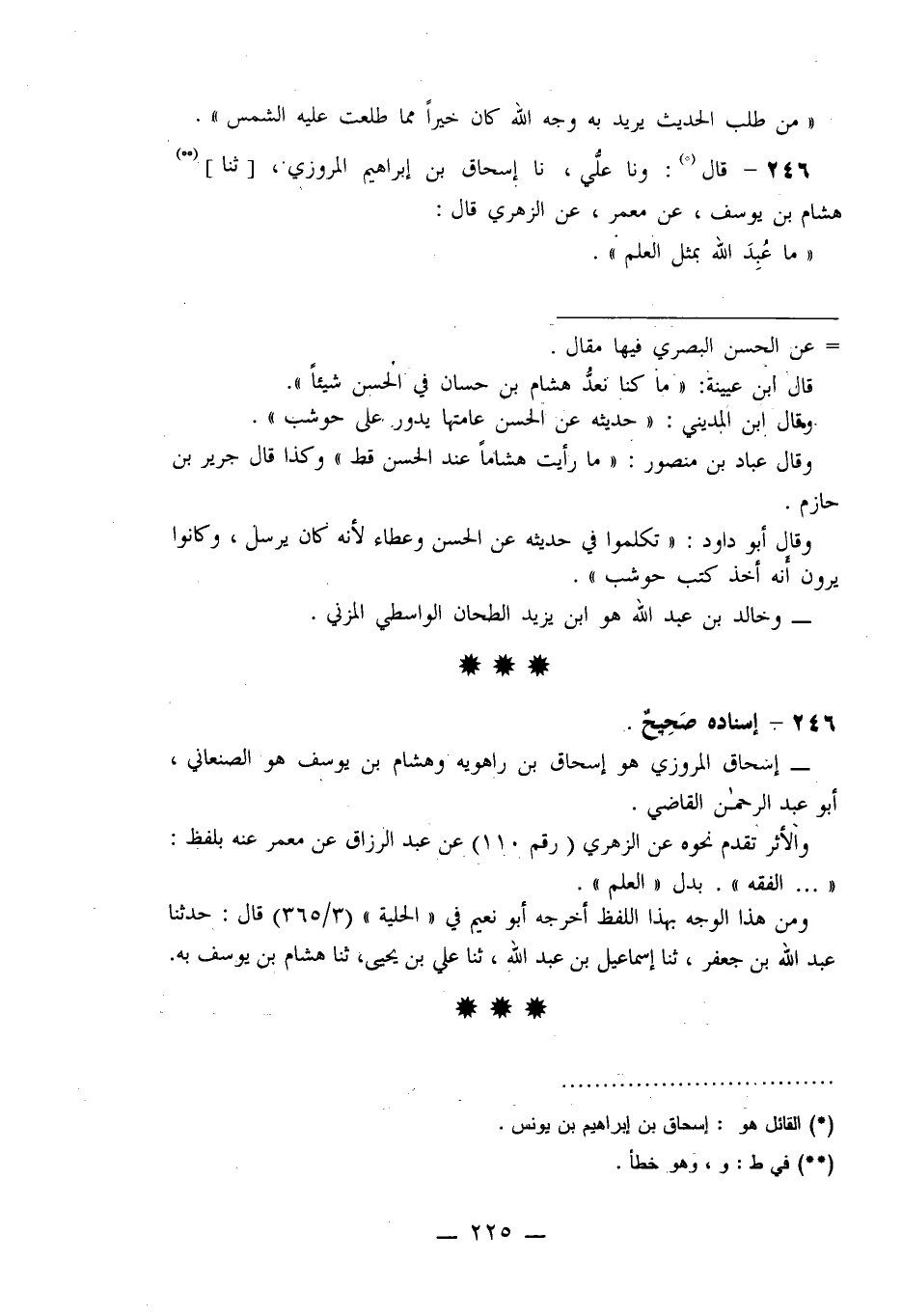 246 - قَالَ: وَنا عَلِيٌّ، نا إِسْحَاقُ بْنُ إِبْرَاهِيمَ الْمَرْوَزِيُّ، ثنا هِشَامُ بْنُ يُوسُفَ، عَنْ مَعْمَرٍ، عَنِ الزُّهْرِيِّ قَالَ: §«مَا عُبِدَ اللَّهُ بِمِثْلِ الْعِلْمِ»