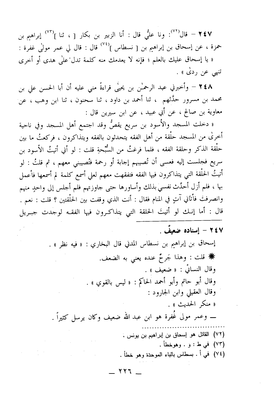247 - قَالَ: وَنا عَلِيٌّ قَالَ: أنا الزُّبَيْرُ بْنُ بَكَّارٍ، ثنا إِبْرَاهِيمُ بْنُ حَمْزَةَ، عَنْ إِسْحَاقَ بْنِ إِبْرَاهِيمَ بْنِ نِسْطَاسٍ قَالَ: قَالَ لِي عُمَرُ مَوْلَى غُفْرَةَ: «يَا إِسْحَاقُ §عَلَيْكَ بِالْعِلْمِ؛ فَإِنَّهُ لَا يَعْدِمُكَ مِنْهُ كَلِمَةٌ تَدُلُّ عَلَى هُدًى أَوْ أُخْرَى تَنْهَى عَنْ رَدًى»