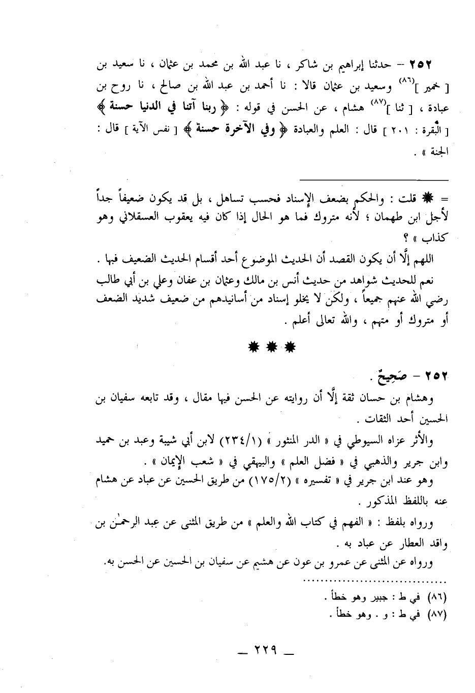 252 - حَدَّثَنَا إِبْرَاهِيمُ بْنُ شَاكِرٍ، نا عَبْدُ اللَّهِ بْنُ مُحَمَّدِ بْنِ عُثْمَانَ، نا سَعِيدُ بْنُ خُمَيْرٍ، وَسَعِيدُ بْنُ عُثْمَانَ قَالَا: نا أَحْمَدُ بْنُ عَبْدِ اللَّهِ بْنِ صَالِحٍ، نا رَوْحُ بْنُ عُبَادَةَ، ثنا هِشَامٌ، عَنِ الْحَسَنِ فِي قَوْلِهِ {§رَبَّنَا آتِنَا فِي الدُّنْيَا حَسَنَةً} [البقرة: 201] قَالَ: «الْعِلْمُ وَالْعِبَادَةُ» ، {وَفِي الْآخِرَةِ حَسَنَةً} [البقرة: 201] قَالَ: «الْجَنَّةُ»
