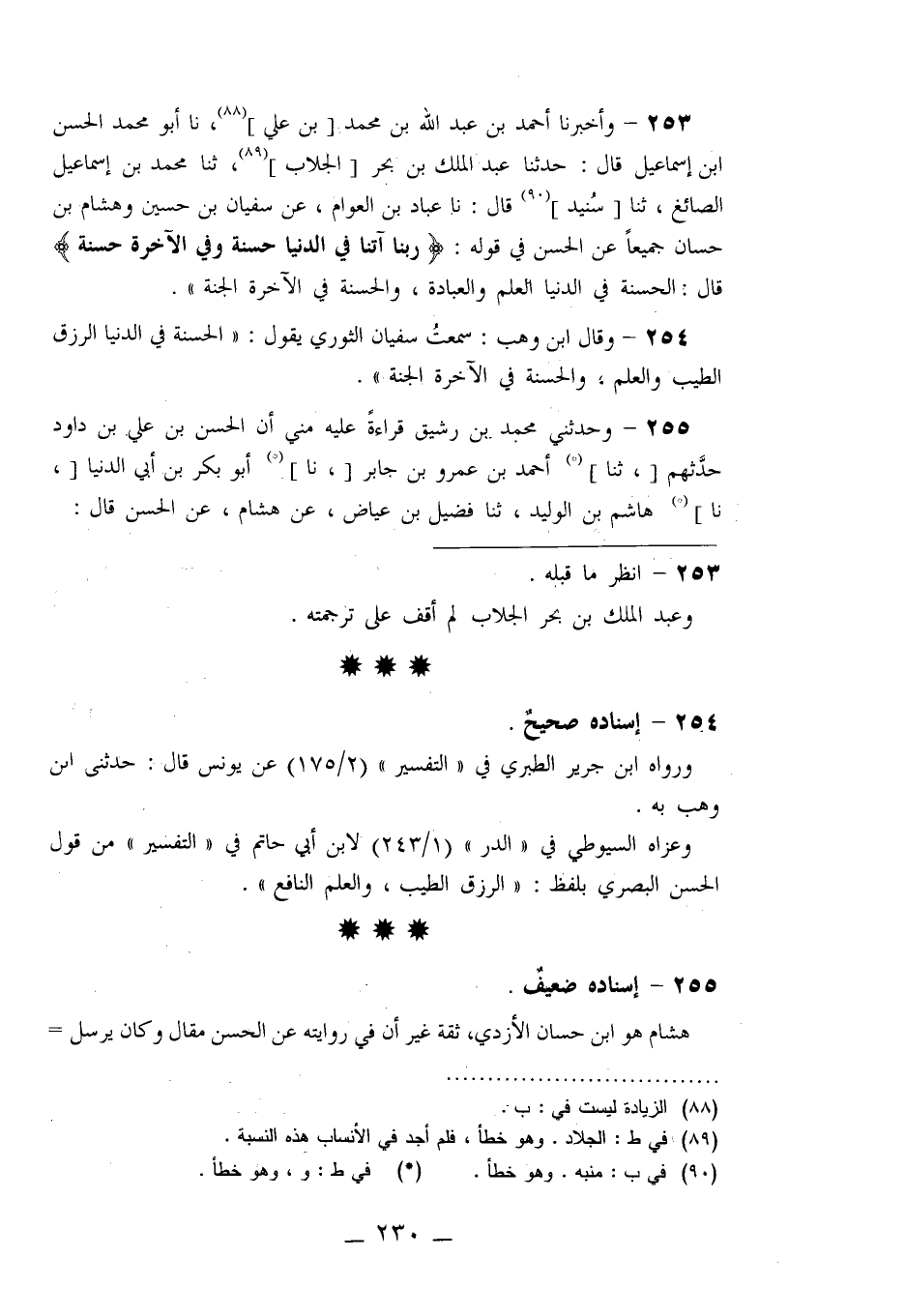 253 - وَأَخْبَرَنَا أَحْمَدُ بْنُ عَبْدِ اللَّهِ بْنِ مُحَمَّدِ بْنِ عَلِيٍّ، نا أَبُو مُحَمَّدٍ الْحَسَنُ بْنُ إِسْمَاعِيلَ قَالَ: حَدَّثَنَا عَبْدُ الْمَلِكِ بْنُ بَحْرٍ الْجَلَّابُ، ثنا مُحَمَّدُ بْنُ إِسْمَاعِيلَ الصَّائِغُ، ثنا سُنَيْدٌ قَالَ: نا عَبَّادُ بْنُ الْعَوَّامِ، عَنْ سُفْيَانَ بْنِ حُسَيْنٍ، وَهِشَامِ بْنِ حَسَّانَ جَمِيعًا عَنِ الْحَسَنِ فِي قَوْلِهِ {§رَبَّنَا آتِنَا فِي الدُّنْيَا حَسَنَةً وَفِي الْآخِرَةِ حَسَنَةً} [البقرة: 201] قَالَ: «الْحَسَنَةُ فِي الدُّنْيَا الْعِلْمُ وَالْعِبَادَةُ، وَالْحَسَنَةُ فِي الْآخِرَةِ الْجَنَّةُ»