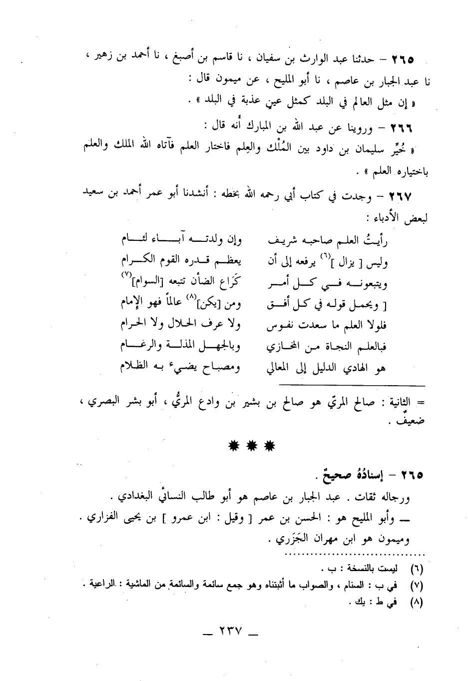 265 - حَدَّثَنَا عَبْدُ الْوَارِثِ بْنُ سُفْيَانَ، نا قَاسِمُ بْنُ أَصْبَغَ، نا أَحْمَدُ بْنُ زُهَيْرٍ، نا عَبْدُ الْجَبَّارِ بْنُ عَاصِمٍ، نا أَبُو الْمَلِيحِ، عَنْ مَيْمُونٍ قَالَ: «إِنَّ §مَثَلَ الْعَالِمِ فِي الْبَلَدِ كَمَثَلِ عَيْنٍ عَذْبَةٍ فِي الْبَلَدِ»