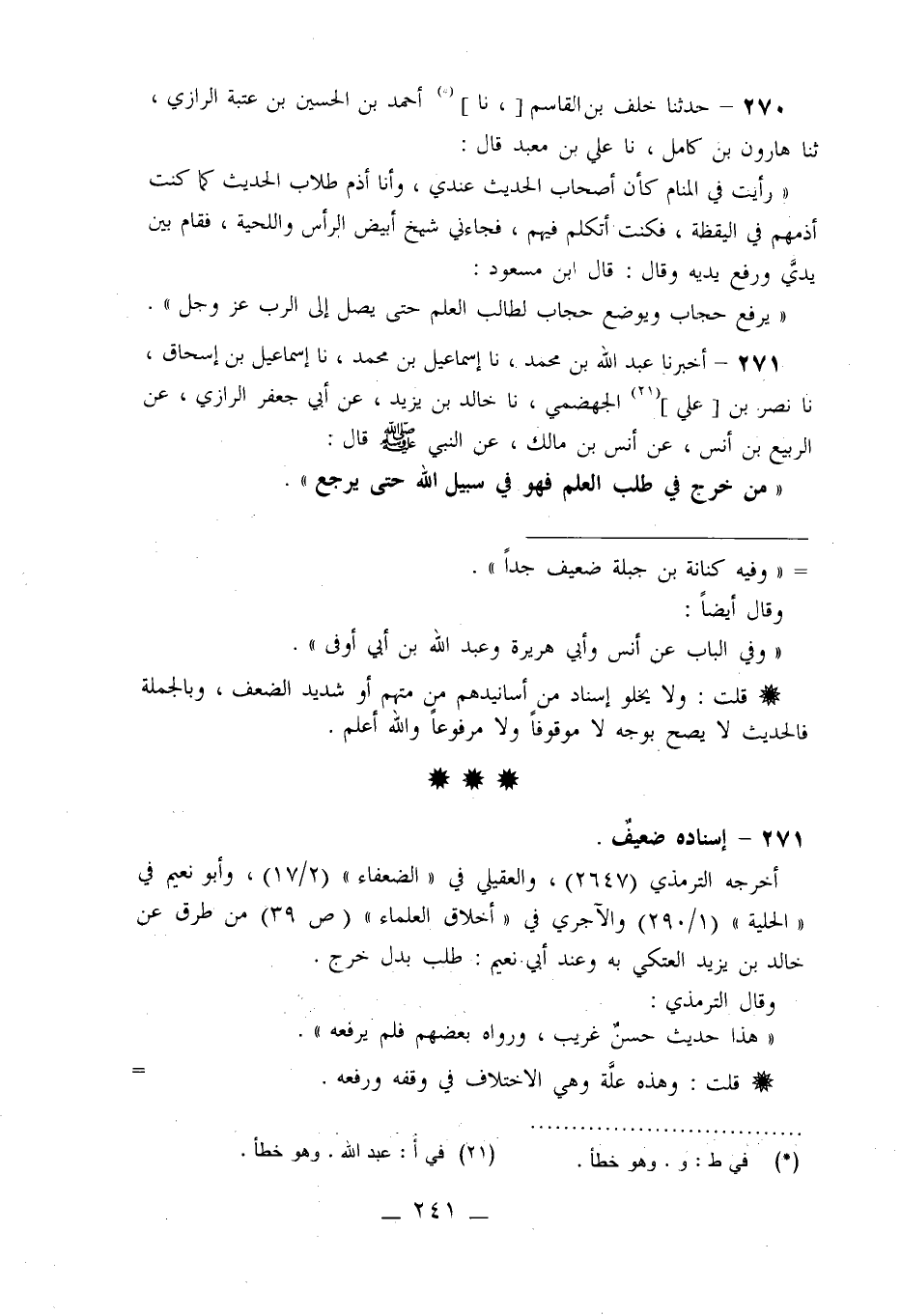271 - أَخْبَرَنَا عَبْدُ اللَّهِ بْنُ مُحَمَّدٍ، نا إِسْمَاعِيلُ بْنُ مُحَمَّدٍ، نا إِسْمَاعِيلُ بْنُ إِسْحَاقَ، نا نَصْرُ بْنُ عَلِيٍّ الْجَهْضَمِيُّ، نا خَالِدُ بْنُ يَزِيدَ، عَنْ أَبِي جَعْفَرٍ الرَّازِيِّ، عَنِ الرَّبِيعِ بْنِ أَنَسٍ، عَنْ أَنَسِ بْنِ مَالِكٍ، عَنِ النَّبِيِّ صَلَّى اللَّهُ عَلَيْهِ وَسَلَّمَ قَالَ: §«مَنْ خَرَجَ فِي طَلَبِ الْعِلْمِ فَهُوَ فِي سَبِيلِ اللَّهِ حَتَّى يَرْجِعَ»