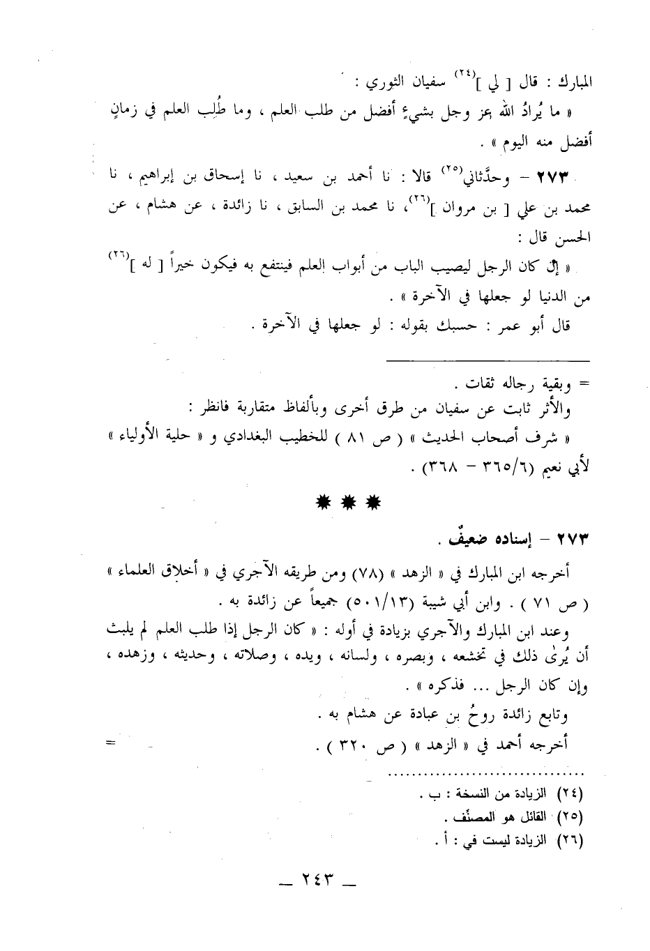 273 - وَحَدَّثَانِي قَالَا: نا أَحْمَدُ بْنُ سَعِيدٍ، نا إِسْحَاقُ بْنُ إِبْرَاهِيمَ، نا مُحَمَّدُ بْنُ عَلِيِّ بْنِ مَرْوَانَ، نا مُحَمَّدُ بْنُ السَّابِقِ، نا زَائِدَةُ، عَنْ هِشَامٍ، عَنِ الْحَسَنِ قَالَ: «إِنْ كَانَ §الرَّجُلُ لَيُصِيبُ الْبَابَ مِنْ أَبْوَابِ الْعِلْمِ فَيَنْتَفِعُ بِهِ فَيَكُونُ خَيْرًا لَهُ مِنَ الدُّنْيَا لَوْ جَعَلَهَا فِي الْآخِرَةِ» قَالَ أَبُو عُمَرَ: " حَسْبُكَ بِقَوْلِهِ: لَوْ جَعَلَهَا فِي الْآخِرَةِ "
