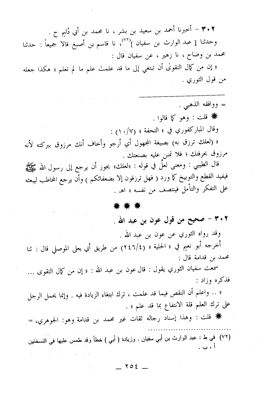 302 - أَخْبَرَنَا أَحْمَدُ بْنُ سَعِيدِ بْنِ بِشْرٍ، نا مُحَمَّدُ بْنُ أَبِي دُلَيْمٍ، ح وَحَدَّثَنَا عَبْدُ الْوَارِثِ بْنُ سُفْيَانَ، نا قَاسِمُ بْنُ أَصْبَغَ قَالَا جَمِيعًا: حَدَّثَنَا مُحَمَّدُ بْنُ وَضَّاحٍ، نا زُهَيْرٌ، عَنْ سُفْيَانَ قَالَ: «إِنَّ §مِنْ كَمَالِ التَّقْوَى أَنْ تَبْتَغِيَ إِلَى مَا قَدْ عَلِمْتَ عِلْمَ مَا لَمْ تَعْلَمْ» هَكَذَا جَعَلَهُ مِنْ قَوْلِ الثَّوْرِيِّ