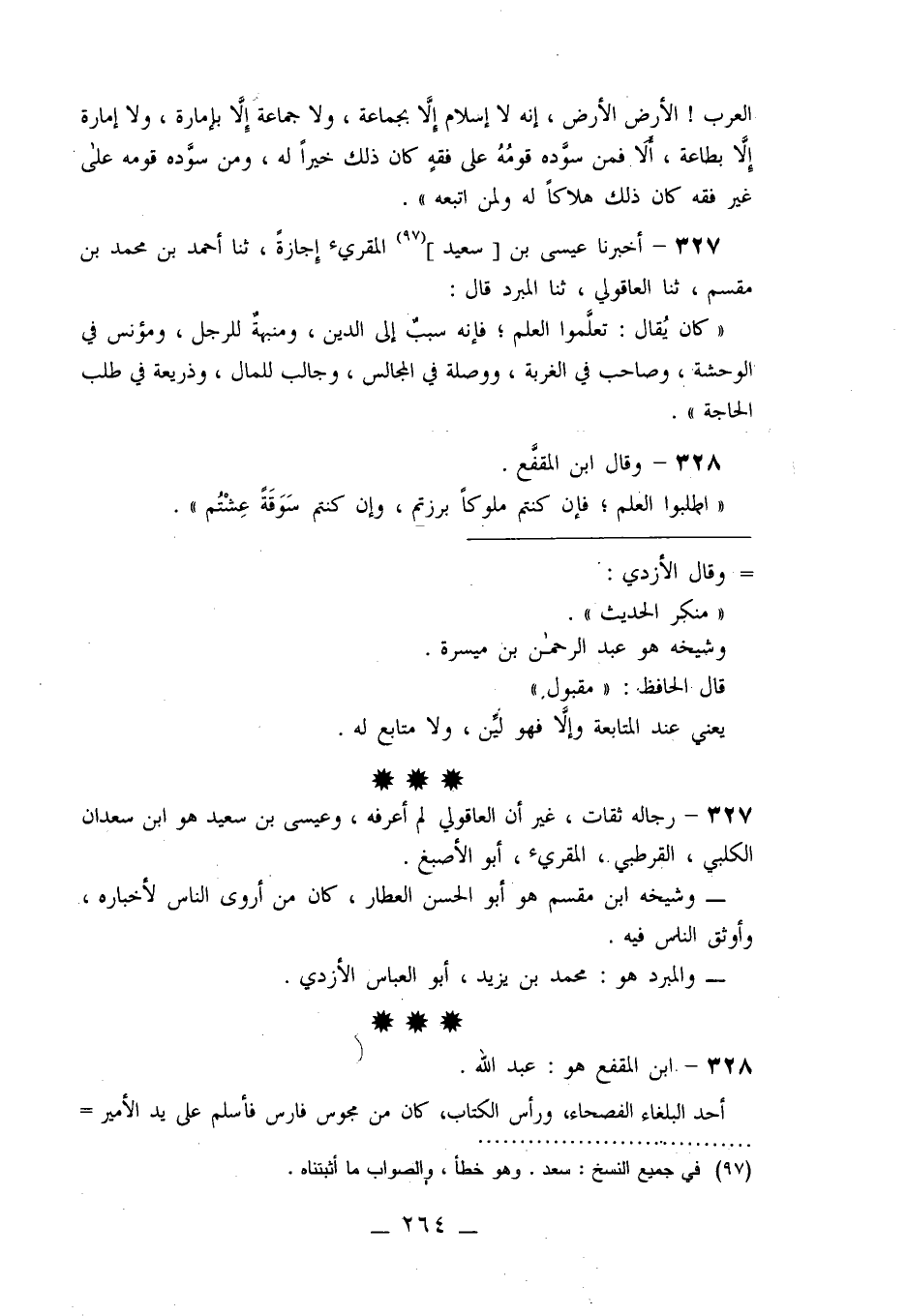 327 - أَخْبَرَنَا عِيسَى بْنُ سَعِيدٍ الْمُقْرِئُ، إِجَازَةً، ثنا أَحْمَدُ بْنُ مُحَمَّدِ بْنِ مِقْسَمٍ، ثنا الْعَاقُولِيُّ، ثنا الْمُبَرِّدُ قَالَ: " كَانَ يُقَالُ: §تَعَلَّمُوا الْعِلْمَ فَإِنَّهُ سَبَبٌ إِلَى الدِّينِ، وَمَنْبَهَةٌ لِلرَّجُلِ، وَمُؤْنِسٌ فِي الْوَحْشَةِ، وَصَاحِبٌ فِي الْغُرْبَةِ، وَوَصْلَةٌ إِلَى الْمَجَالِسِ، وَجَالِبٌ لِلْمَالِ، وَذَرِيعَةٌ فِي طَلَبِ الْحَاجَةِ"