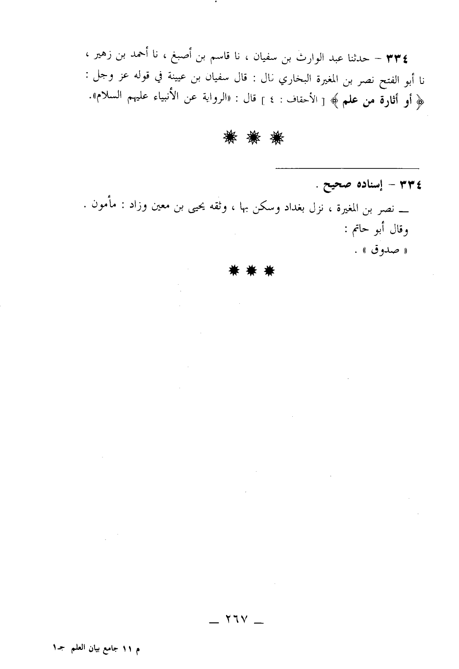 334 - حَدَّثَنَا عَبْدُ الْوَارِثِ بْنُ سُفْيَانَ، نا قَاسِمُ بْنُ أَصْبَغَ، نا أَحْمَدُ بْنُ زُهَيْرٍ، نا أَبُو الْفَتْحِ نَصْرُ بْنُ الْمُغِيرَةِ الْبُخَارِيُّ قَالَ: قَالَ سُفْيَانُ بْنُ عُيَيْنَةَ فِي قَوْلِهِ عَزَّ وَجَلَّ {§أَوْ أَثَارَةٍ مِنْ عِلْمٍ} [الأحقاف: 4] قَالَ: «الرِّوَايَةُ عَنِ الْأَنْبِيَاءِ عَلَيْهِمُ السَّلَامُ»