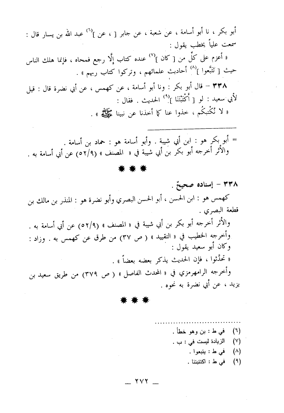 338 - قَالَ أَبُو بَكْرٍ، وَنا أَبُو أُسَامَةَ، عَنْ كَهْمَسٍ، عَنْ أَبِي نَضْرَةَ قَالَ: قِيلَ لِأَبِي سَعِيدٍ: لَوِ اكْتَتَبْتَنَا الْحَدِيثَ فَقَالَ: «لَا نُكْتِبُكُمْ §خُذُوا عَنَّا كَمَا أَخَذْنَا عَنْ نَبِيِّنَا صَلَّى اللَّهُ عَلَيْهِ وَسَلَّمَ»