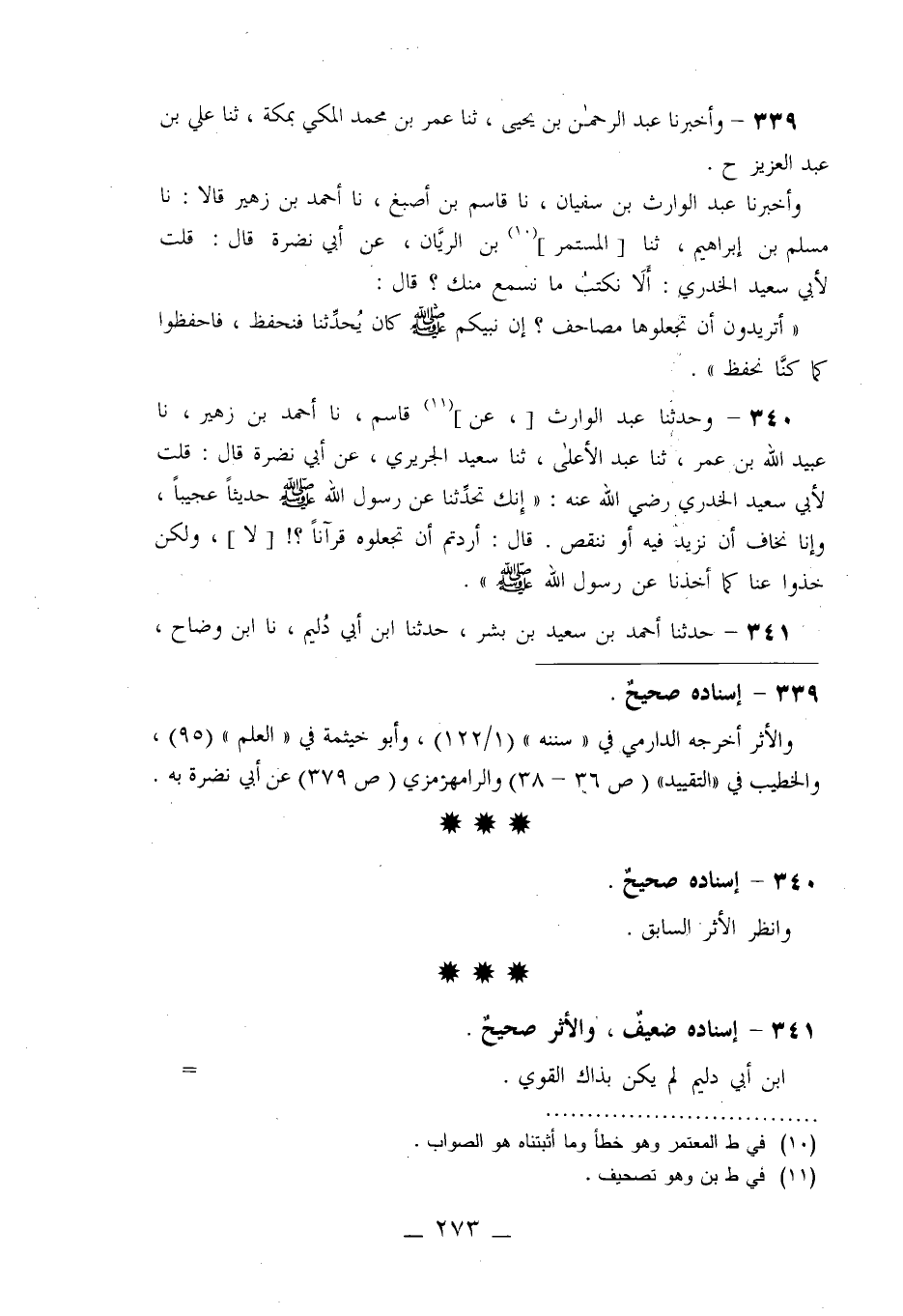 339 - وَأَخْبَرَنَا عَبْدُ الرَّحْمَنِ بْنُ يَحْيَى، ثَنَا عُمَرُ بْنُ مُحَمَّدٍ الْمَكِّيُّ، بِمَكَّةَ ثنا عَلِيُّ بْنُ عَبْدِ الْعَزِيزِ، ح وَأَخْبَرَنَا عَبْدُ الْوَارِثِ بْنُ سُفْيَانَ، نا قَاسِمُ بْنُ أَصْبَغَ، نا أَحْمَدُ بْنُ زُهَيْرٍ قَالَا: نا مُسْلِمُ بْنُ إِبْرَاهِيمَ، ثنا الْمُسْتَمِرُّ بْنُ الرَّيَّانِ، عَنْ أَبِي نَضْرَةَ قَالَ: " قُلْتُ لِأَبِي سَعِيدٍ الْخُدْرِيِّ: أَلَا §نَكْتُبُ مَا نَسْمَعُ مِنْكَ؟ قَالَ: «أَتُرِيدُونَ أَنْ تَجْعَلُوهَا مَصَاحِفَ، إِنَّ نَبِيَّكُمْ صَلَّى اللَّهُ عَلَيْهِ وَسَلَّمَ كَانَ يُحَدِّثُنَا فَنَحْفَظُ فَاحْفَظُوا كَمَا كُنَّا نَحْفَظُ»