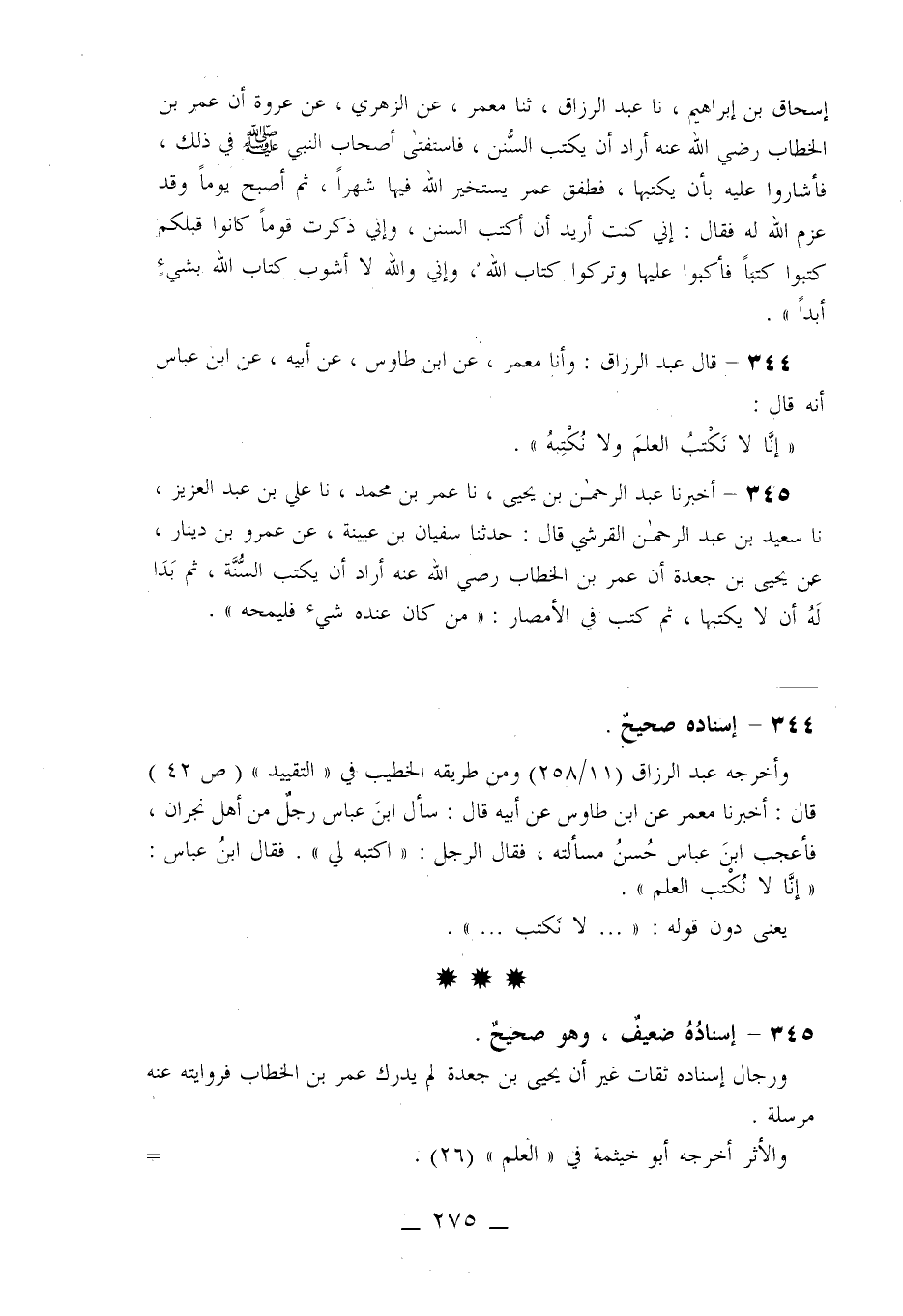 344 - قَالَ عَبْدُ الرَّزَّاقِ، وَأنا مَعْمَرٌ، عَنِ ابْنِ طَاوُسٍ، عَنْ أَبِيهِ، عَنِ ابْنِ عَبَّاسٍ، أَنَّهُ قَالَ: §«إِنَّا لَا نَكْتُبُ الْعِلْمَ وَلَا نُكْتِبُهُ»
