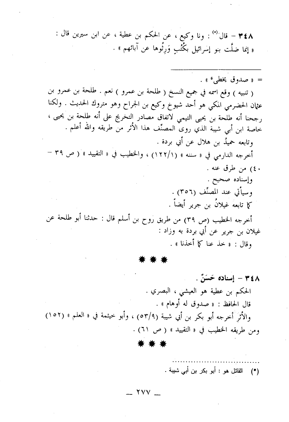 348 - قَالَ: وَنا وَكِيعٌ، عَنِ الْحَكَمِ بْنِ عَطِيَّةَ، عَنِ ابْنِ سِيرِينَ قَالَ: «إِنَّمَا §ضَلَّتْ بَنُو إِسْرَائِيلَ بِكُتُبٍ وَرِثُوهَا عَنْ آبَائِهِمْ»