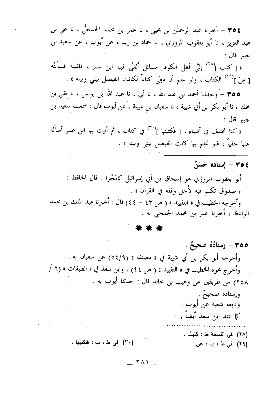 354 - أَخْبَرَنَا عَبْدُ الرَّحْمَنِ بْنُ يَحْيَى، نا عُمَرُ بْنُ مُحَمَّدٍ الْجُمَحِيُّ، نا عَلِيُّ بْنُ عَبْدِ الْعَزِيزِ، نا أَبُو يَعْقُوبَ الْمَرْوَزِيُّ، نا حَمَّادُ بْنُ زَيْدٍ، عَنْ أَيُّوبَ، عَنْ سَعِيدِ بْنِ جُبَيْرٍ قَالَ: §«كَتَبَ إِلَيَّ أَهْلُ الْكُوفَةِ مَسَائِلَ أَلْقَى فِيهَا ابْنَ عُمَرَ فَلَقِيتُهُ فَسَأَلْتُهُ مِنَ الْكِتَابِ وَلَوْ عَلِمَ أَنَّ مَعِيَ كِتَابًا لَكَانَتِ الْفَيْصَلَ بَيْنِي وَبَيْنَهُ»