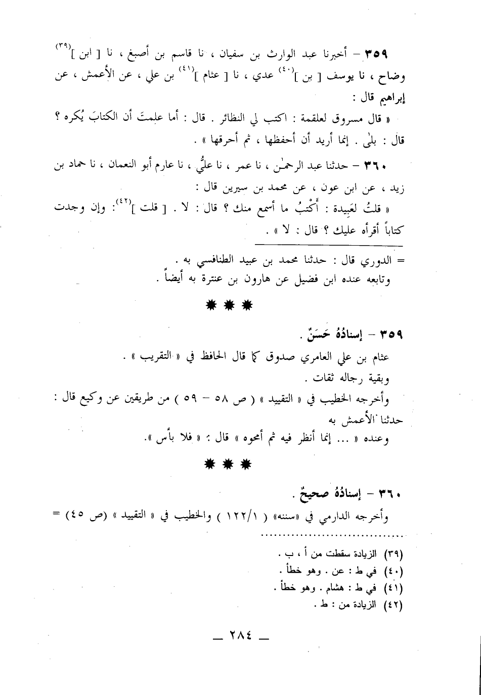 359 - أَخْبَرَنَا عَبْدُ الْوَارِثِ بْنُ سُفْيَانَ، نا قَاسِمُ بْنُ أَصْبَغَ، نا ابْنُ وَضَّاحٍ، نا يُوسُفُ بْنُ عَدِيٍّ، نا عَثَّامُ بْنُ عَلِيٍّ، عَنِ الْأَعْمَشِ، عَنْ إِبْرَاهِيمَ قَالَ: قَالَ مَسْرُوقٌ، لِعَلْقَمَةَ: " §اكْتُبْ لِيَ النَّظَائِرَ قَالَ: أَمَا عَلِمْتَ أَنَّ الْكِتَابَ يُكْرَهُ؟ قَالَ: بَلَى إِنَّمَا أُرِيدُ أَنْ أَحْفَظَهَا ثُمَّ أَحْرِقَهَا "